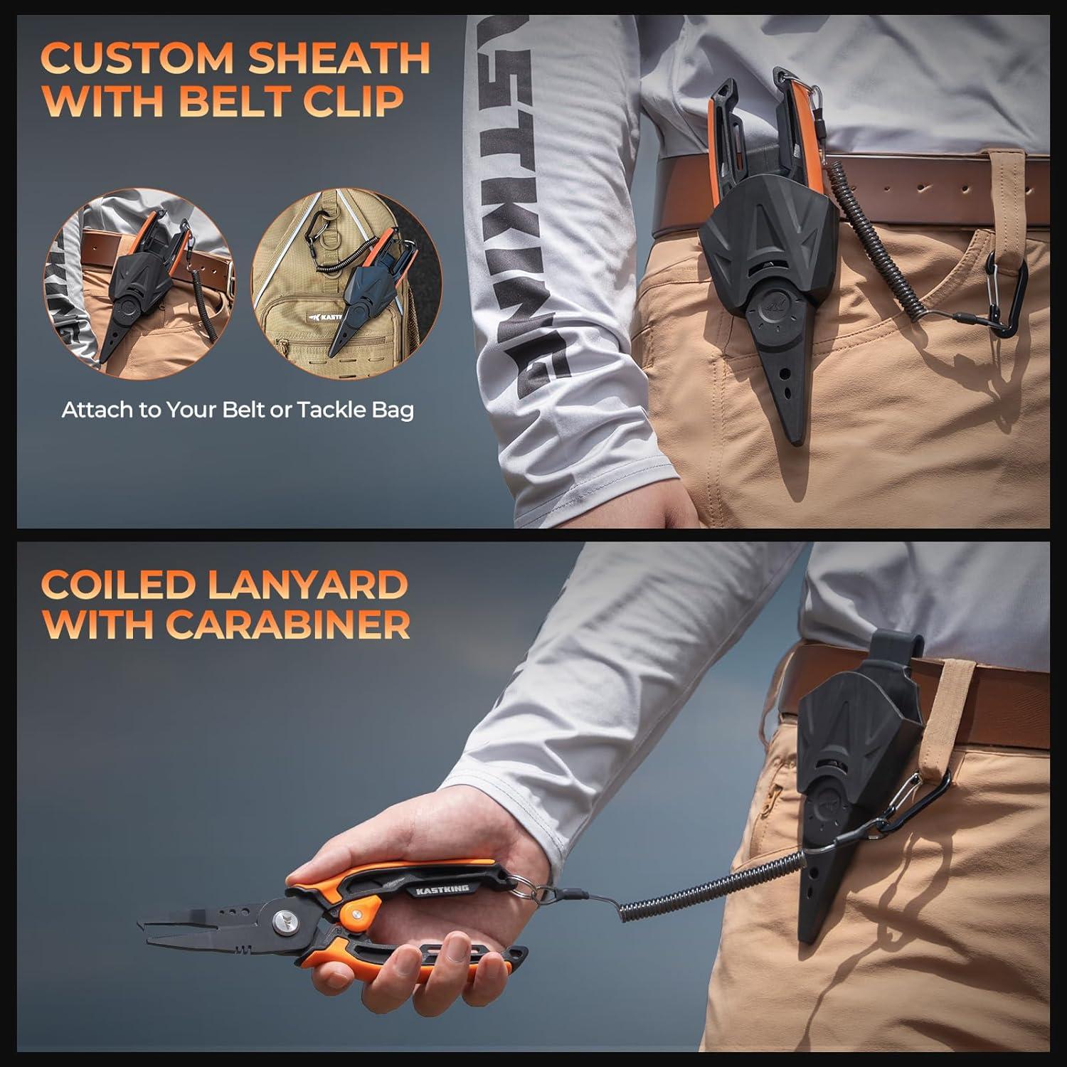 Secure Grip & Carry System Included – Ergonomic non-slip handles provide a strong, confident hold even when wet. A spring-loaded design enables one-handed operation, and the integrated handle lock keeps pliers closed in storage. Includes a molded sheath with belt clip, coiled lanyard, and aluminum carabiner for secure, quick access on the water.