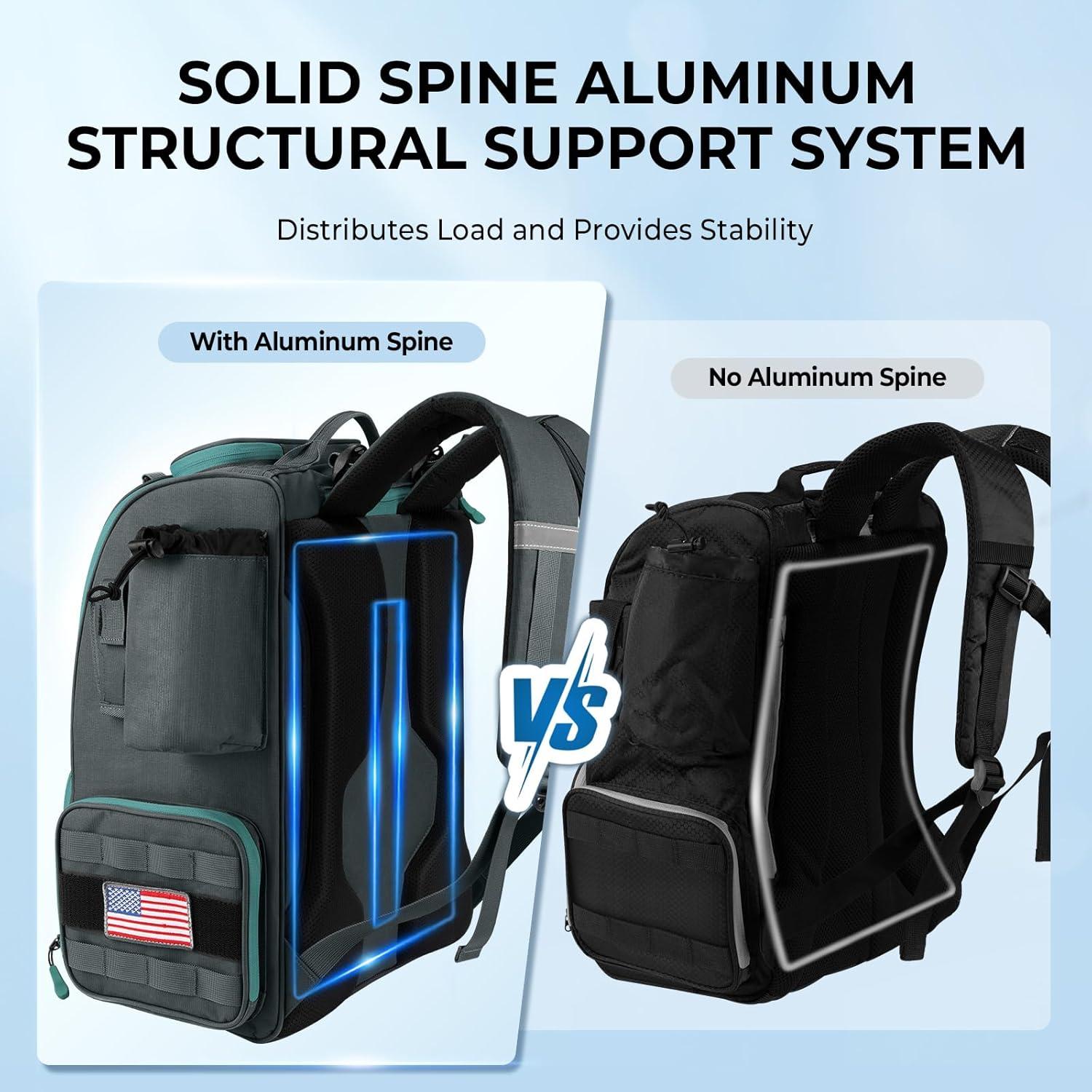 ADVANCED BACK SUPPORT SYSTEM: Bait Boss Pro Fishing Backpack boasts an unparalleled level of comfort and support. The built-in SolidSpine Aluminum Structural Support System distributes the load and provides stability. Combined with breathable material and thick comfortable padding, this system ensures superior comfort during extended wear.