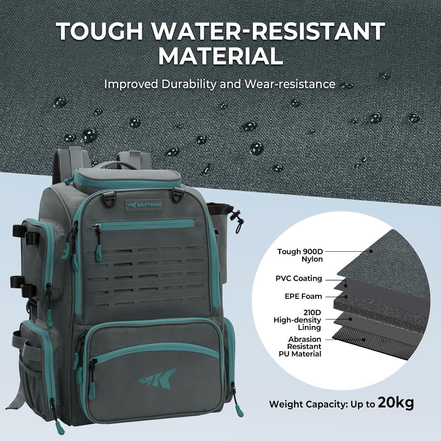 ADJUSTABLE MAIN COMPARTMENT: This fishing backpack has a 45-liter large-capacity storage compartment. The main storage area is easily adjustable with a foldable padded divider in the middle. You can fold down the divider on the main compartment and snap it into place to obtain two equally sized storage spaces. The upper layer holds clothing and snacks, while the lower layer holds four 3600 KastKing tackle boxes (included).