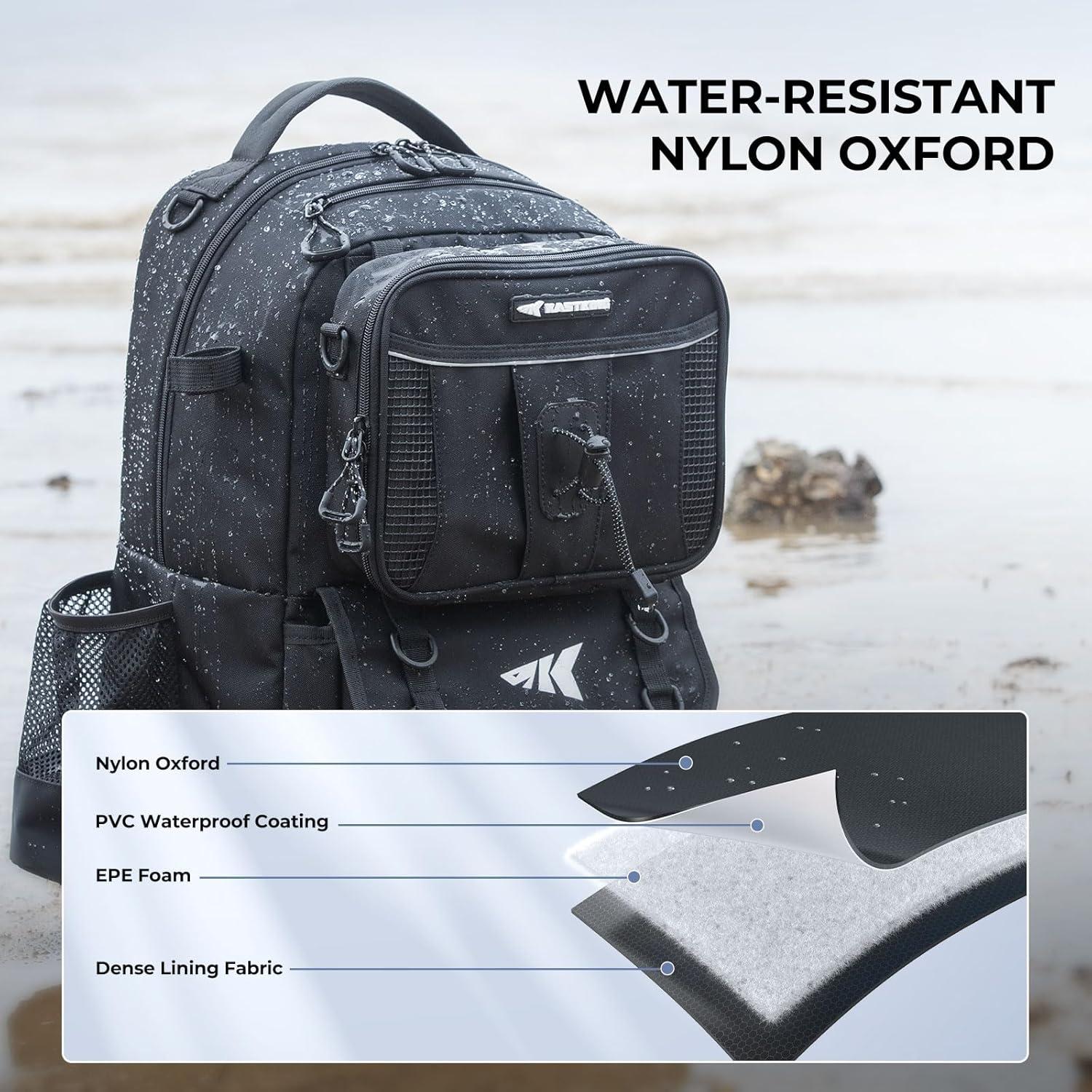 Durable and Water-Resistant: Built for rugged fishing conditions, this backpack is made from heavy-duty rip-stop nylon and water-resistant high-density oxford fabric. The hydrophobic coating offers added protection, keeping your gear dry and safe from splashes, rain, and other outdoor elements.