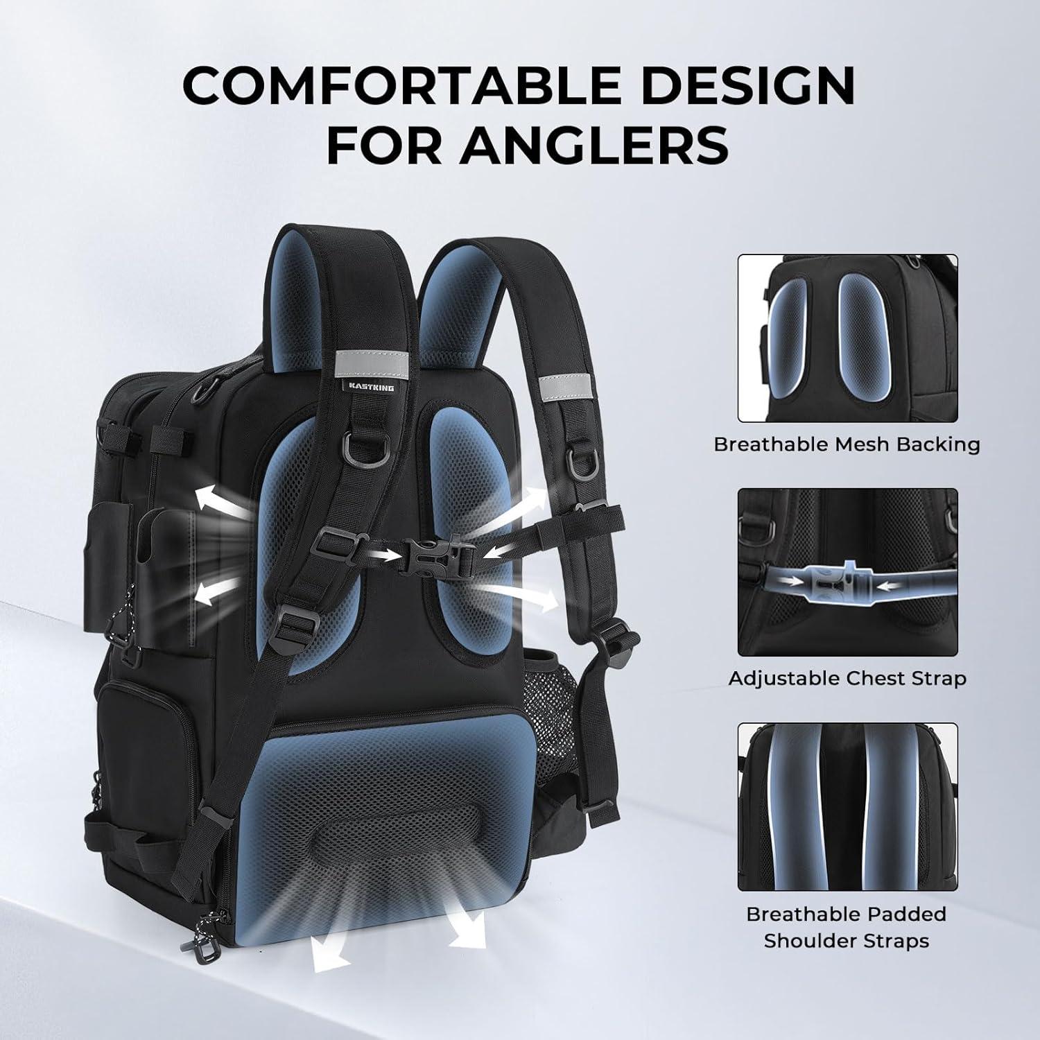 Comfortable and Functional Design: Designed for long fishing trips, this backpack features a breathable padded back pad, ergonomic shoulder straps, and an adjustable chest strap for all-day comfort. Large loop zipper pulls make it easy to open all pockets and access your fishing gear quickly, while multiple D-rings provide convenient attachment points for lanyards, tools, or other essential equipment.