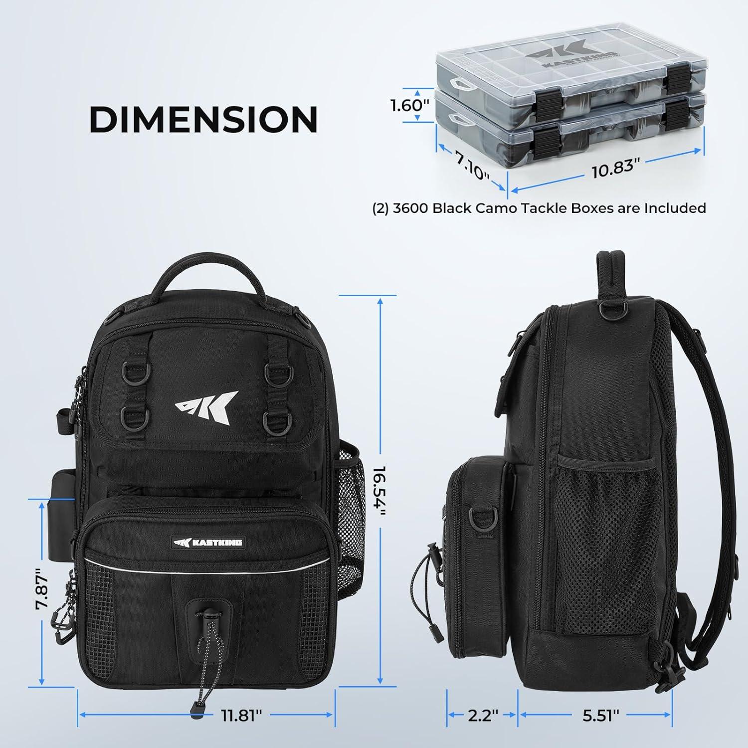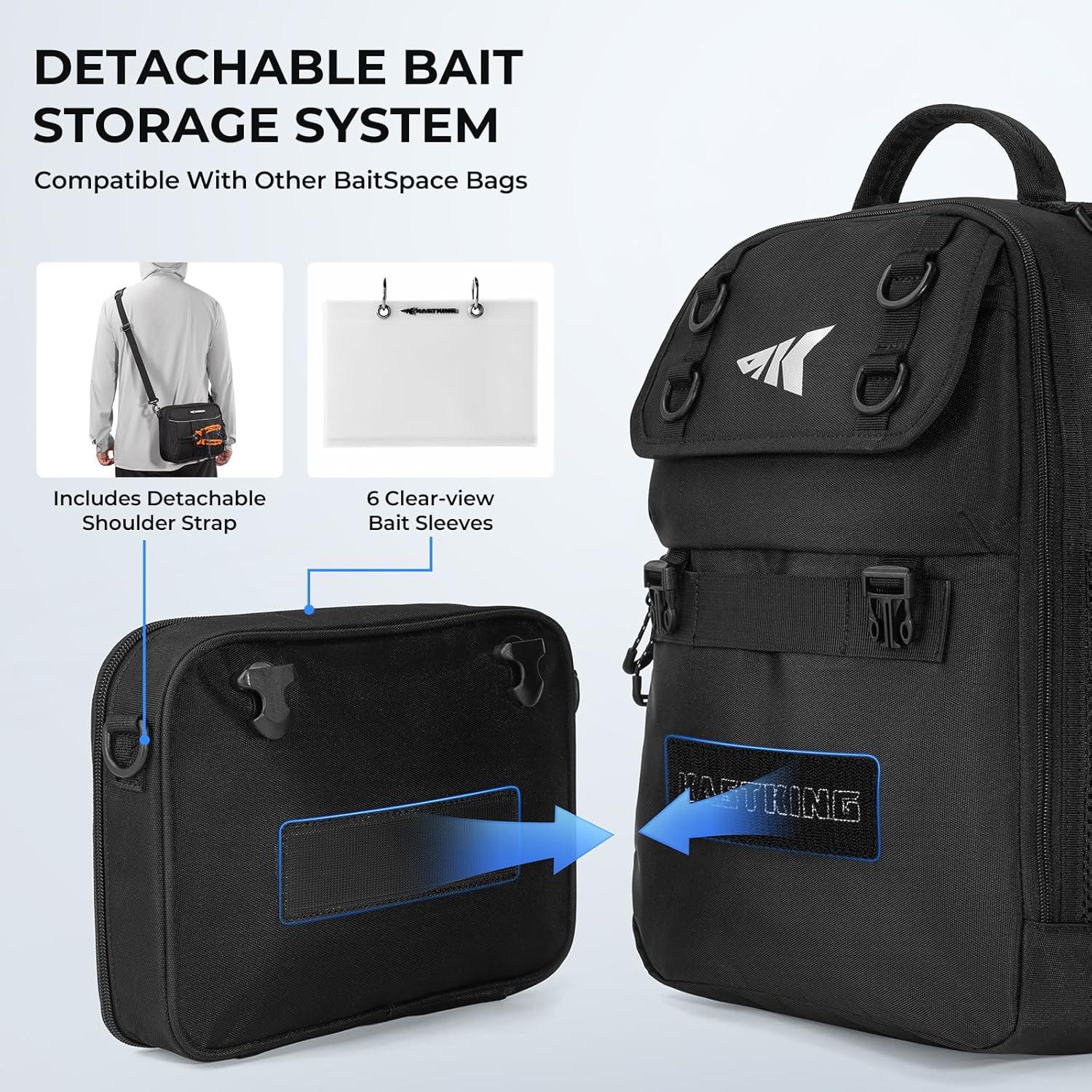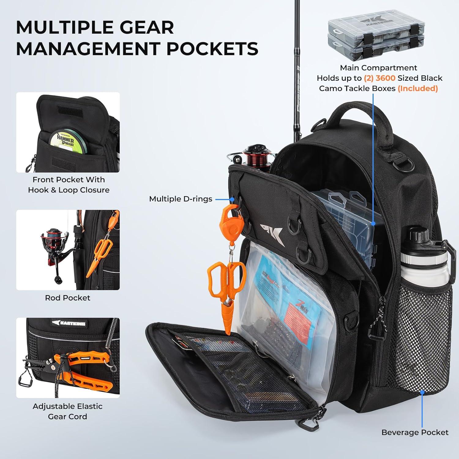 KastKing BaitSpace Fishing Sling Bag, Fishing Backpack with Rod & Beverage Holder, Tackle Bag for Fishing Gear(H: Black – Large(with (2) 3600 tackle boxes))