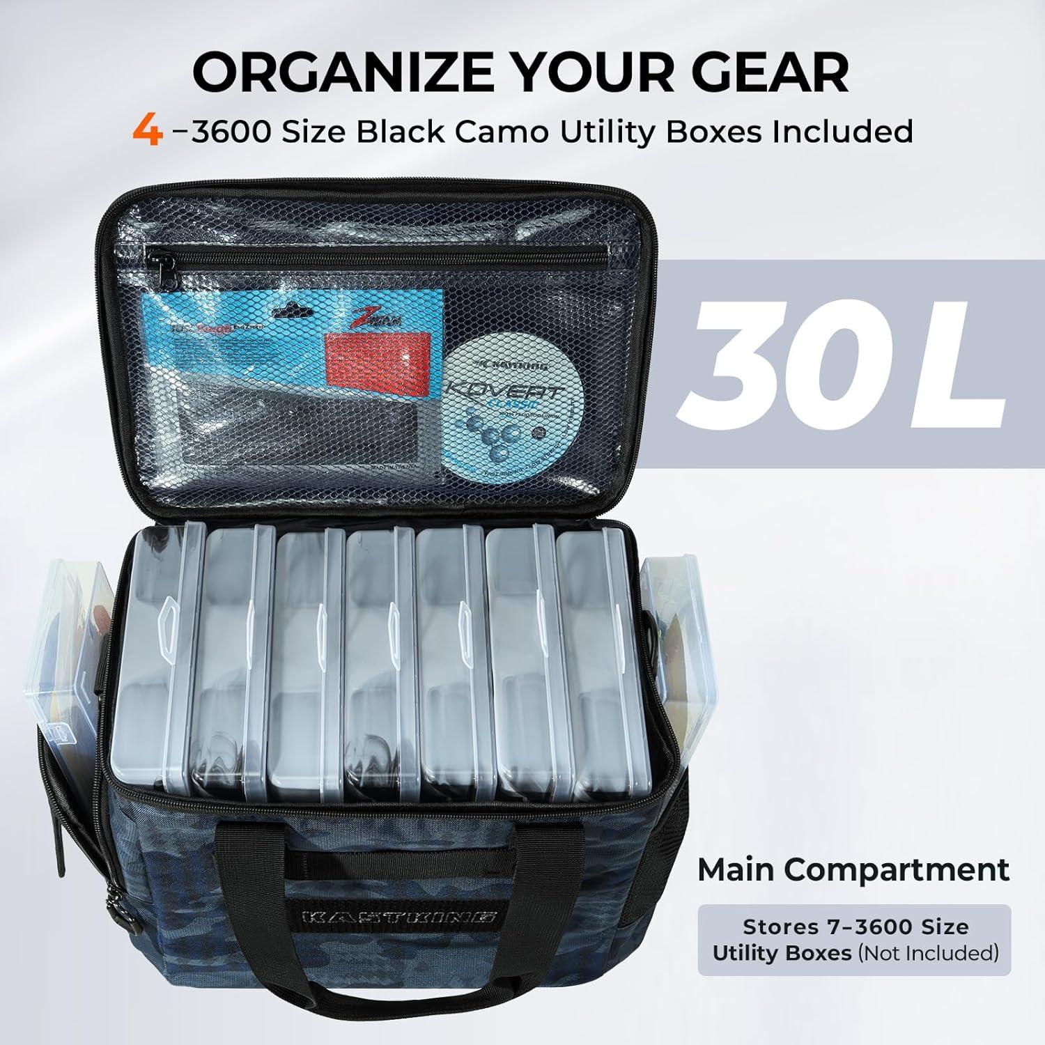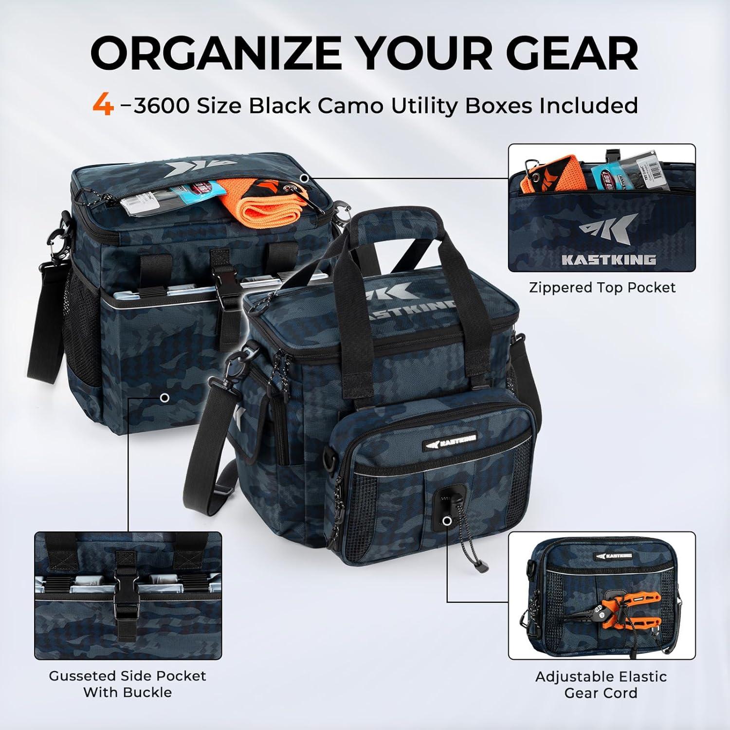 KastKing BaitSpace Fishing Tackle Bag With 4 Tackle Boxes & Removable Bait Binder, Water-Resistant Tackle Storage, Durable Fishing Gear, Adjustable Shoulder Strap(D: Black Camo)