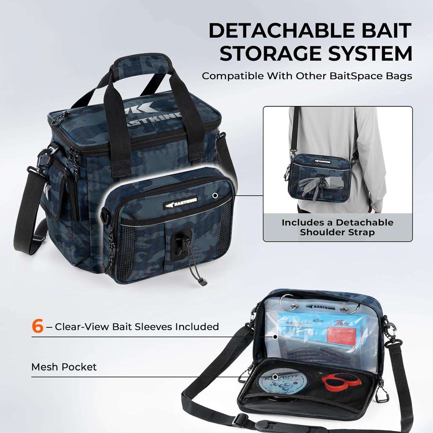 Removable Soft Bait Binder – Each tackle bag features a detachable binder with 6 clear-view bait sleeves, an adjustable elastic band for extra storage, an internal mesh slip pocket, and a detachable shoulder strap. It’s interchangeable with the KastKing BaitSpace Leader Line Bag or Lunch Bag.