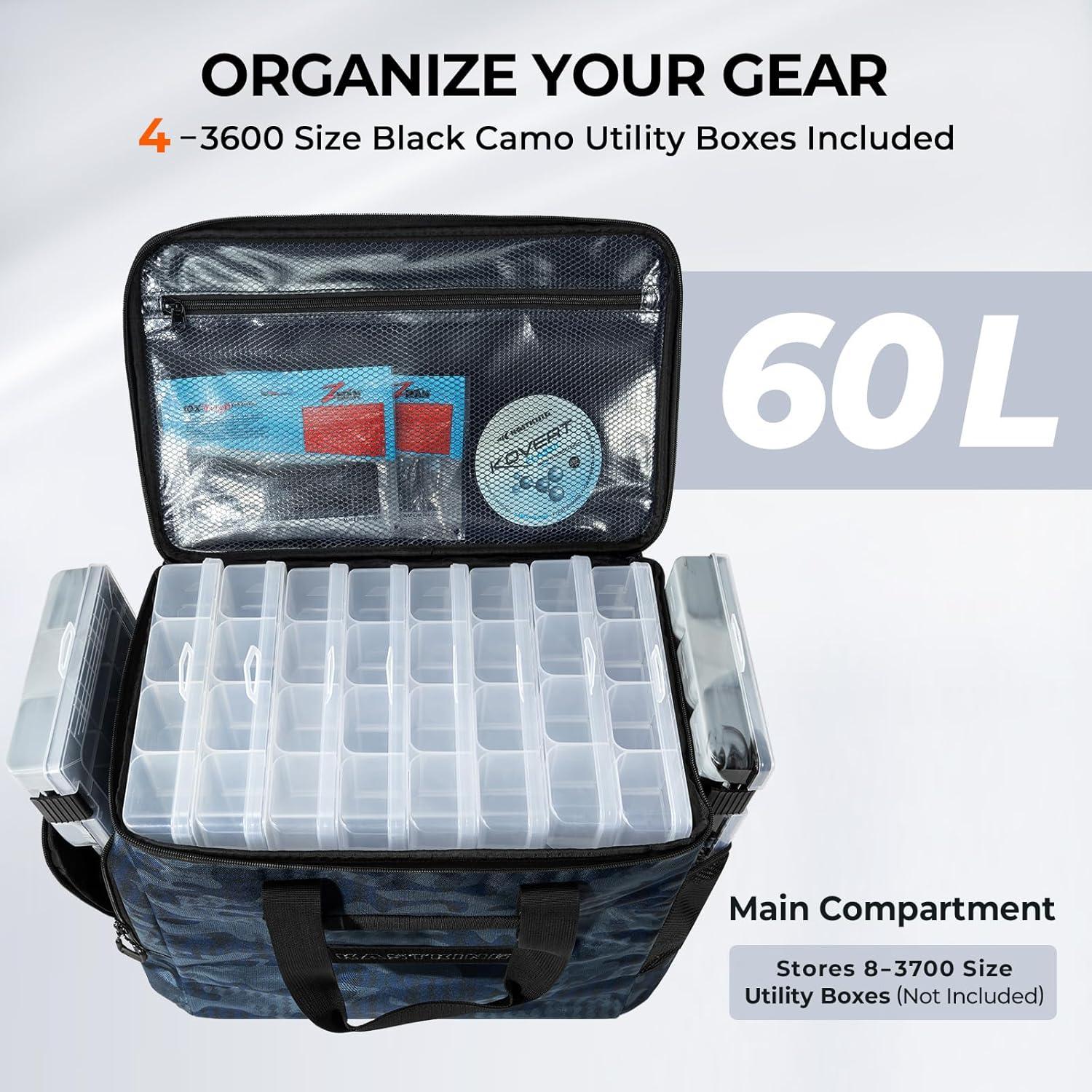 Tackle Storage Capacity – The Large fishing bag holds up to 11 tackle boxs (8-3700 size in the main compartment + 1-3700 size in the side pocket + 2-3600 size in the end pockets), while the Medium holds up to 10 tackle trays (7-3600 size in the main compartment + 1-3600 size in the side pocket + 2-3500 size in the end pockets). Each bag includes 4-3600 size black camo tackle boxs and multiple storage pockets for baits, lures, and fishing tools.
