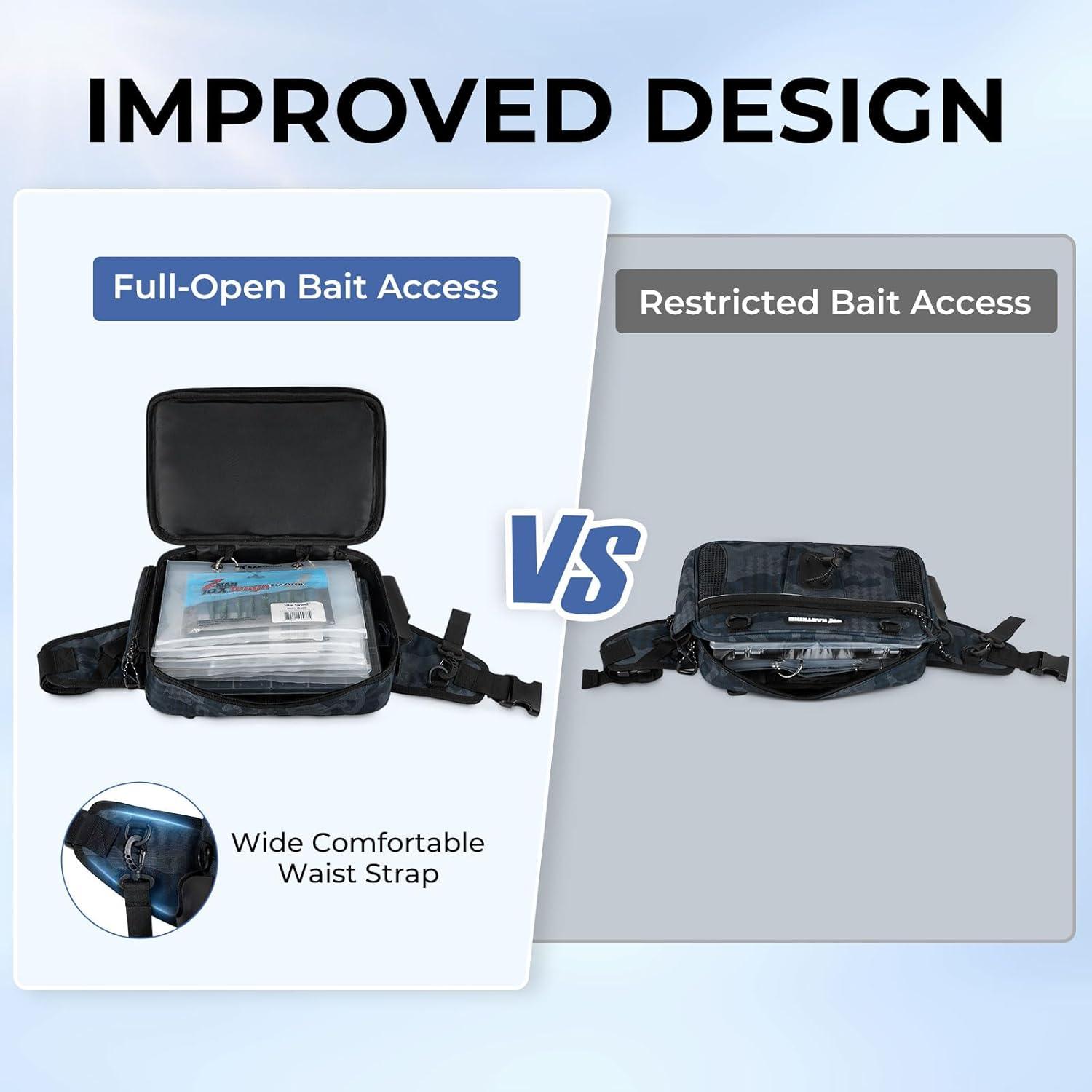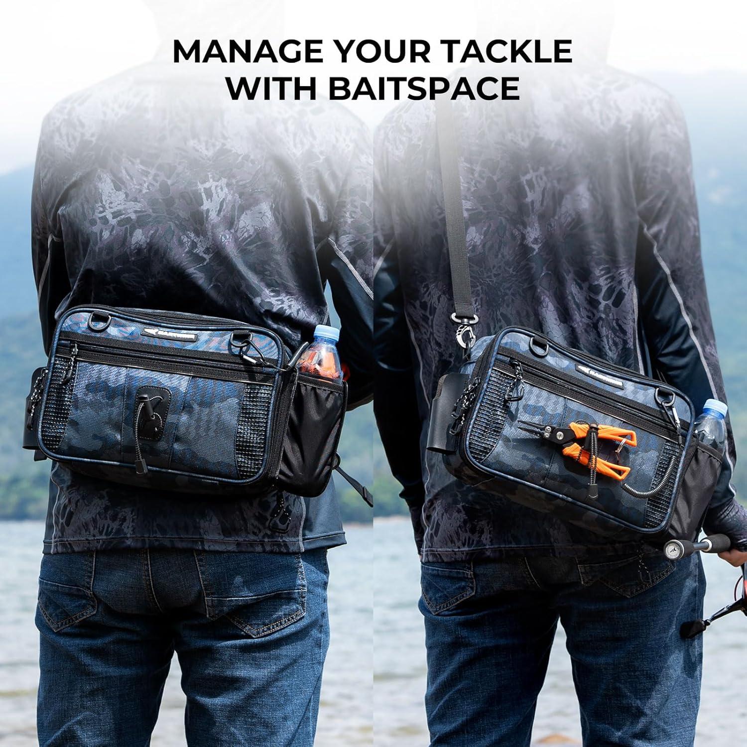 KastKing BaitSpace Waist Bag – Waterproof Tackle Storage Bag With Adjustable Belt, Fishing Fanny Pack for Men, Soft Bait Organizer, 3600 Utility Box, Rod Holder, Nylon(Black Camo)