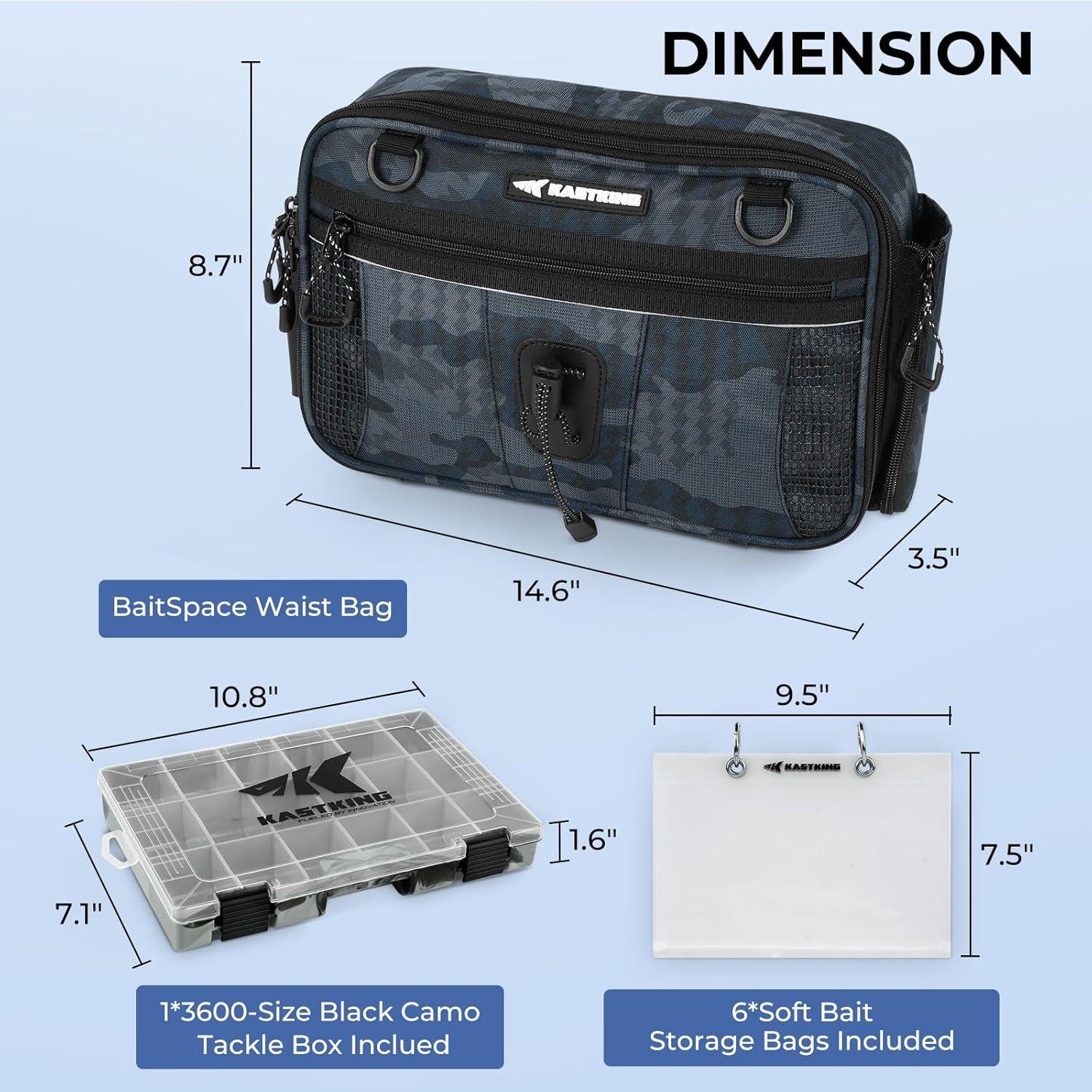 Organize Your Tackle : To keep your baits, lures, and tackle neatly organized, the KastKing BaitSpace Waist Bag includes a 3600-size black camo utility box. This durable box is the perfect solution for securely storing your fishing tackle and accessories, making it easy to access what you need when you’re out on the water. Stay organized and spend more time fishing