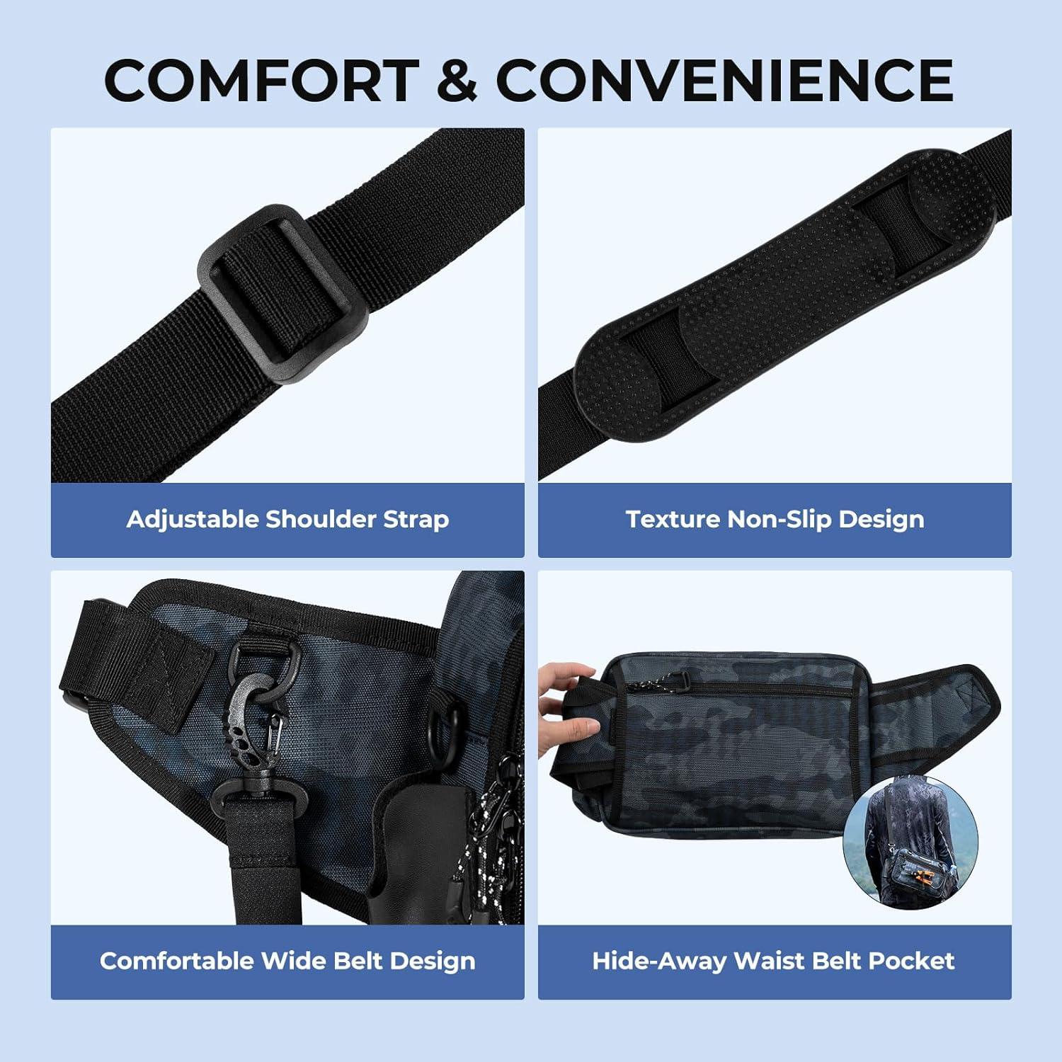 Comfortable and Adjustable for All-Day Use: Stay comfortable during long fishing trips with the BaitSpace Waist Bag's extra-wide belt design. The adjustable waist strap allows for a custom fit and can be conveniently tucked into the rear pocket for quick conversion into a shoulder or chest bag. The textured non-slip pad on the shoulder strap enhances stability and comfort, ensuring the bag stays secure and comfortable no matter how you wear it