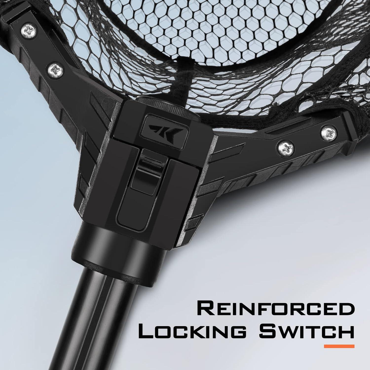 Foldable & Retractable: Using a u-shaped design net hoop, the KastKing Brutus landing net features a push-down switch for a convenient storage. This switch was connected to the net frame and reinforced with four stainless screws. Quickly and easily pull down the release button to retract the net frame. In addition to the retracting handle, the net frame folds in half to reduce the size for easy storage and transportation.