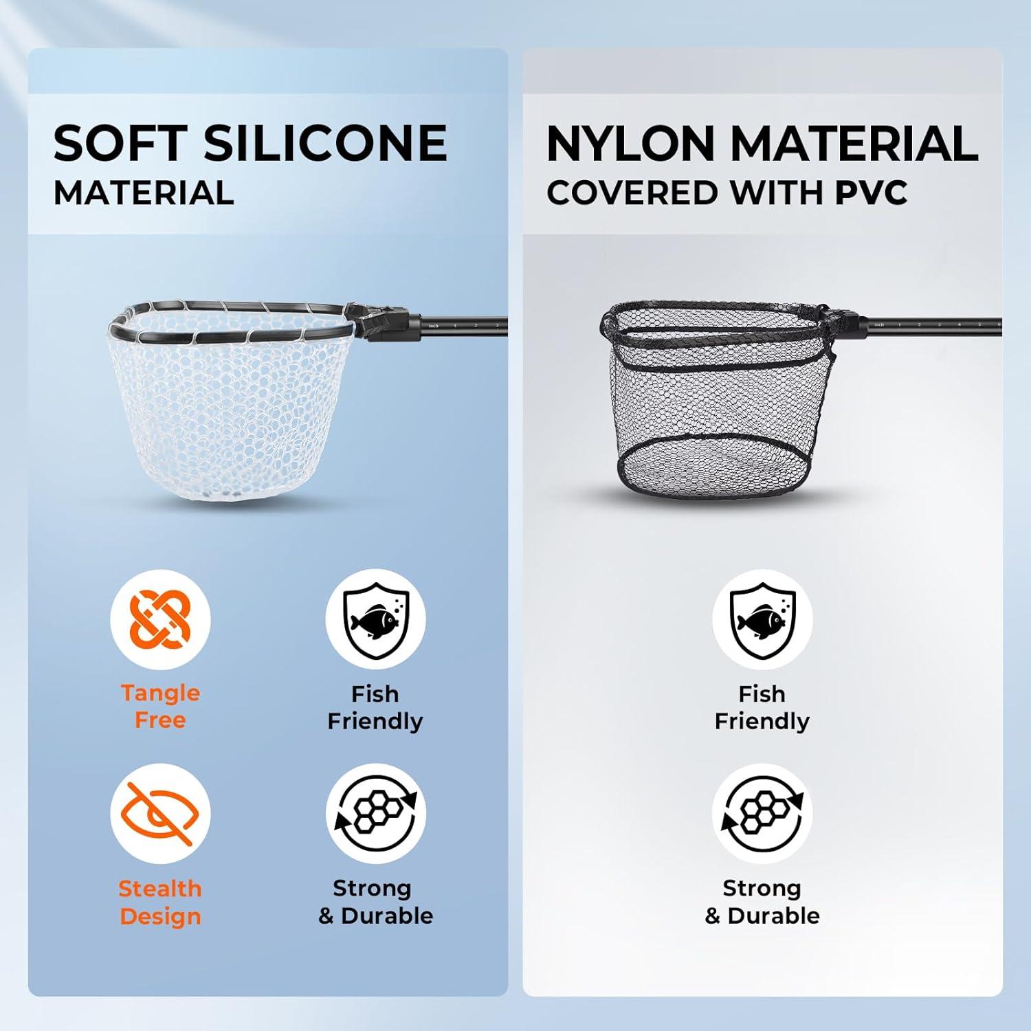 Environmentally Friendly & Stealth Design: Specially designed with two different net choices: nylon covered PVC or, clear silicone. These quality materials guarantee snag and tangle-free performance. Especially the soft silicone material that is fish-friendly so that it reduces harm to fish if you are planning to release your catch. That is a perfect choice for avid anglers practicing catch and release. The clear rubberized nets won’t spook the fish during the landing process.