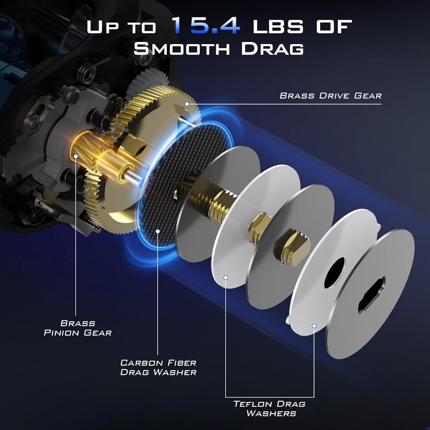 The graphite star-shaped drag system is easy to adjust with a maximum tension of 15.4 pounds. The 10-magnet brake system is easy to adjust and minimizes backlash and a tangled mess inside the reel.