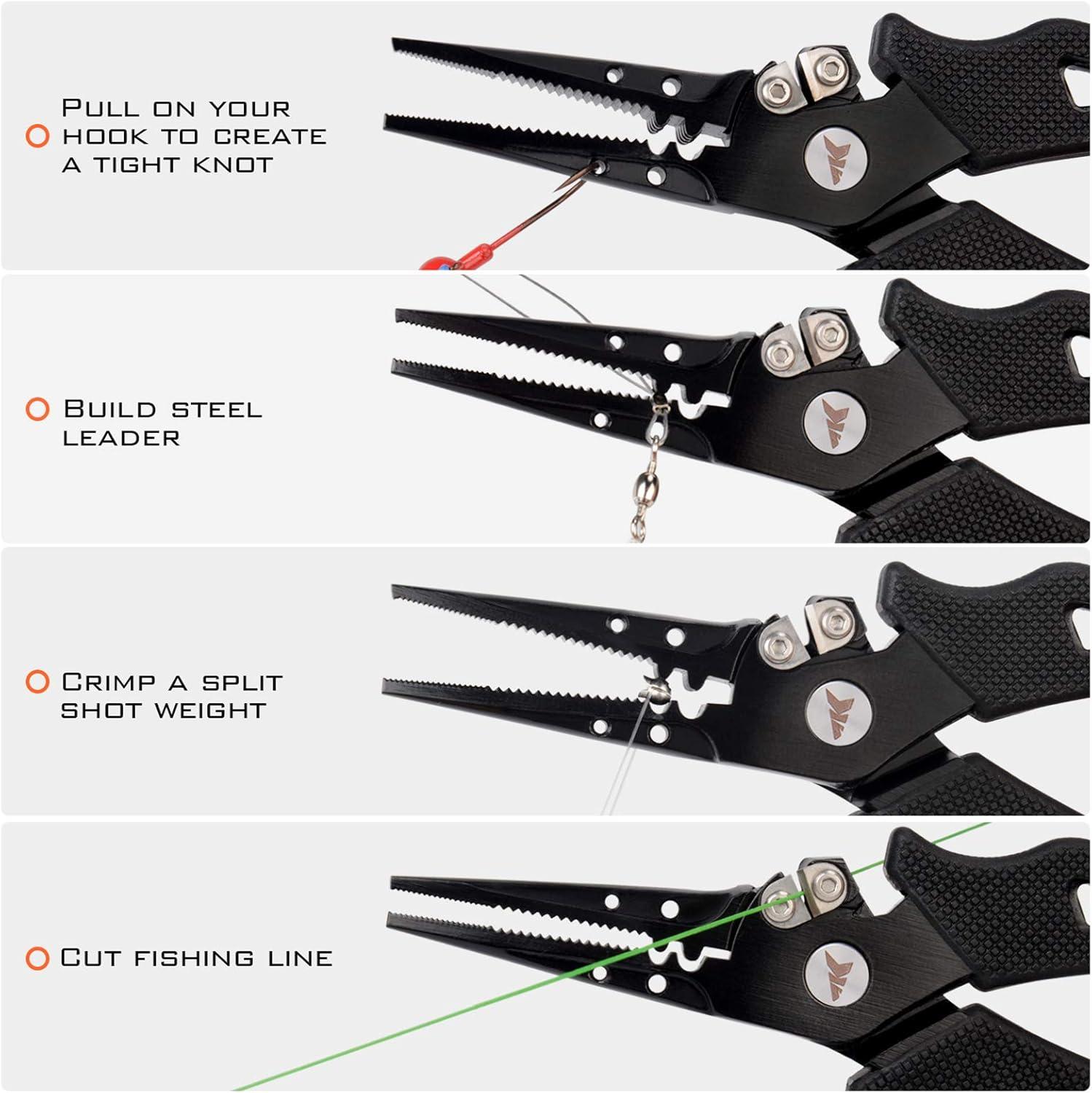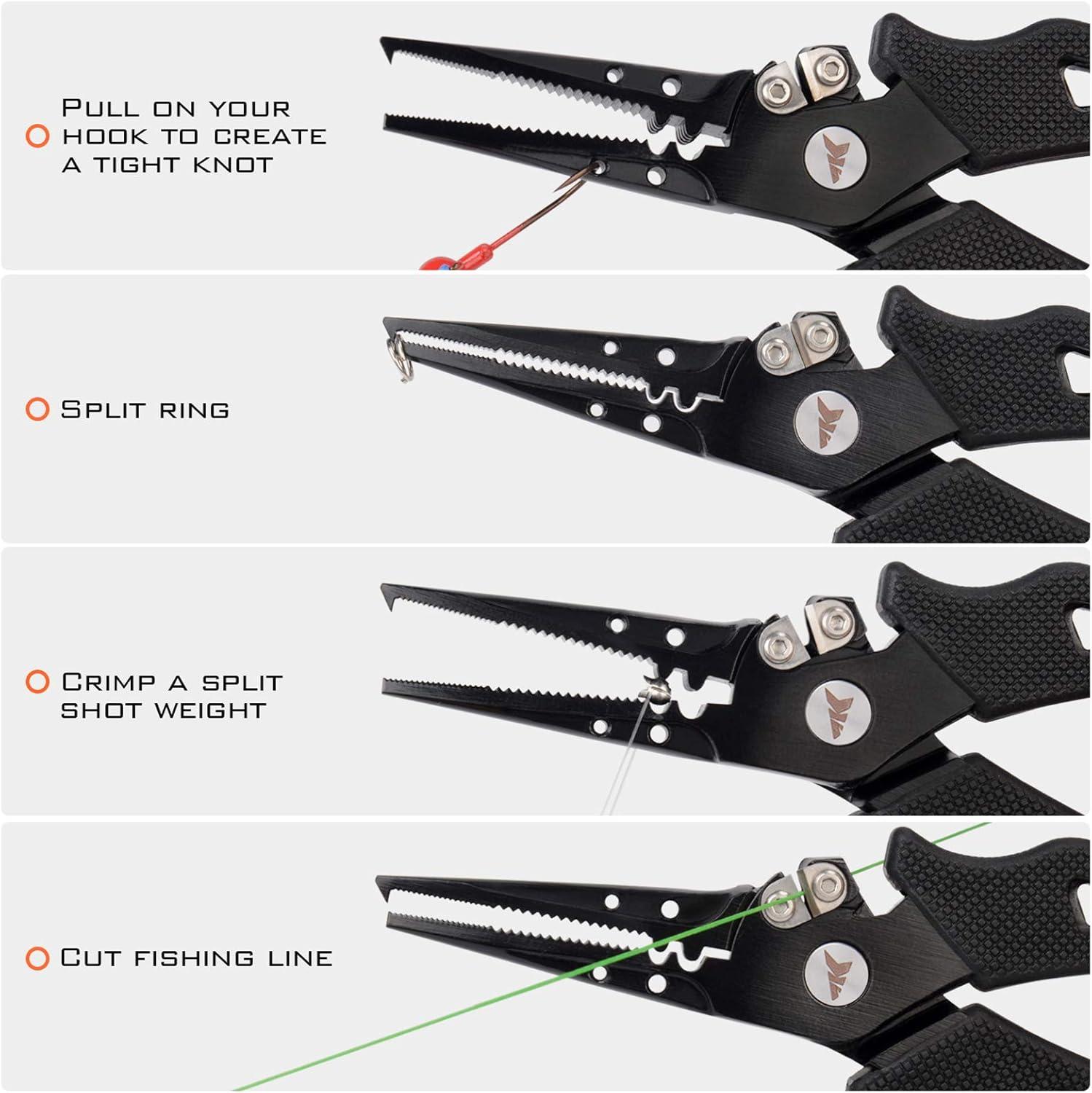 Multi-Function Jaws – Grab and remove any fish hook with the serrated jaws or take advantage of the crimping slots to secure a split shot weight or build a steel leader. To cinch down a knot quickly and safely, insert your hook into one of the holes in the jaws and pull on your hook to create a tight knot. Available in both a straight nose and a Split ring nose design.
