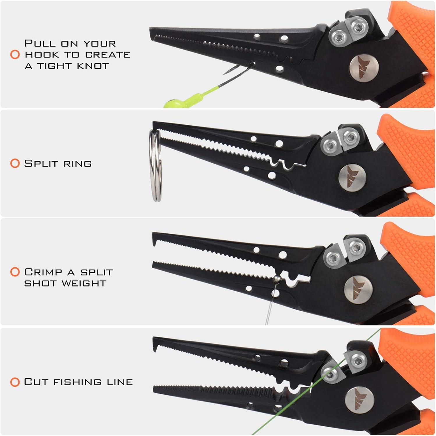 Multi-Function Jaws – Grab and remove any fish hook with the serrated jaws or take advantage of the crimping slots to secure a split shot weight or build a steel leader. To cinch down a knot quickly and safely, insert your hook into one of the holes in the jaws and pull on your hook to create a tight knot. Available in both a straight nose and a Split ring nose design.