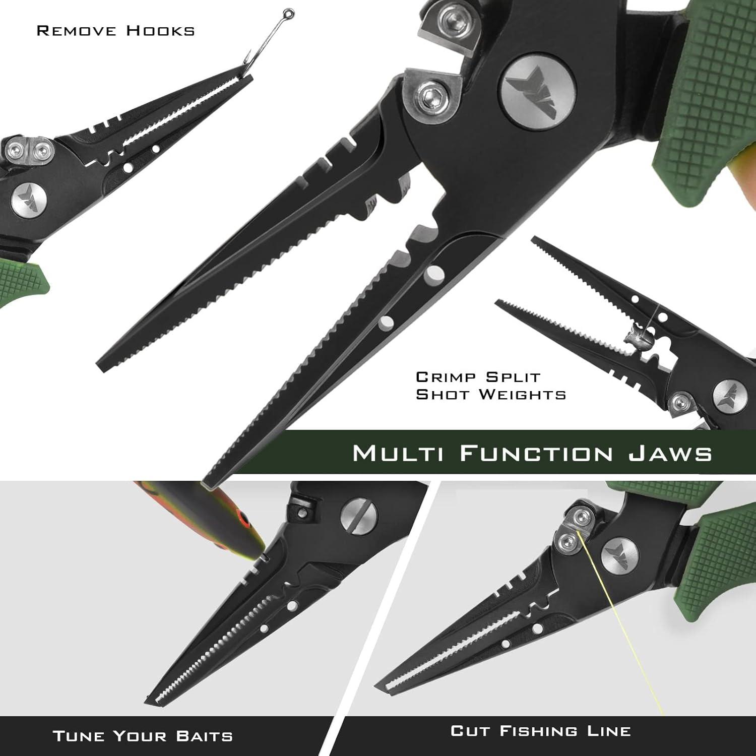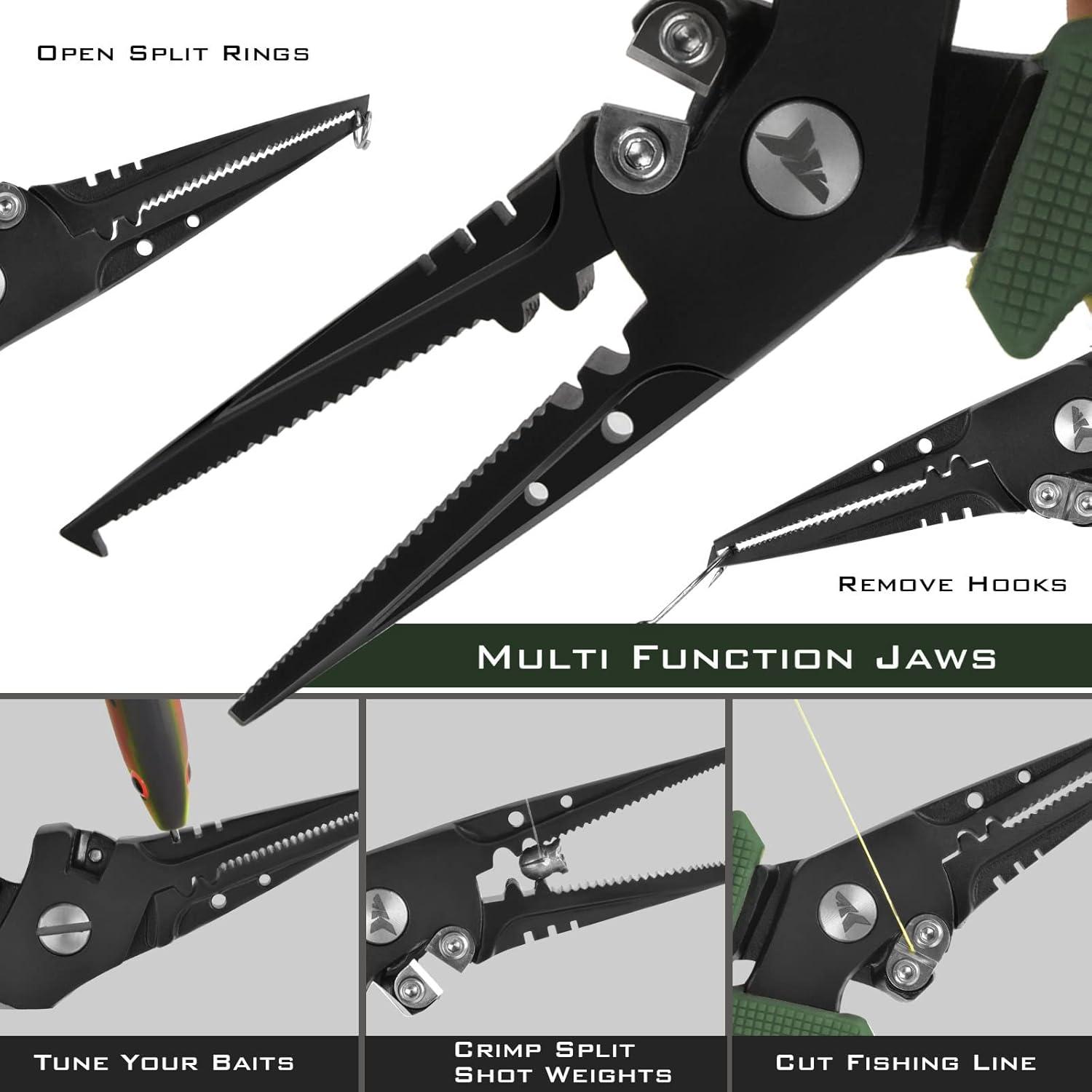 Multi-Function Jaws – Grab and remove any fish hook with the serrated jaws or take advantage of the crimping slots to secure a split shot weight or build a steel leader. To cinch down a knot quickly and safely, insert your hook into one of the holes in the jaws and pull on your hook to create a tight knot. Available in both a straight nose and a Split ring nose design.
