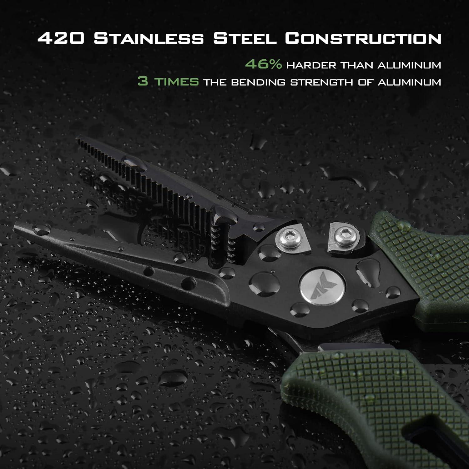 420 Corrosion Resistant Stainless Steel – The KastKing Cutthroat fishing pliers are made from corrosion resistant 420 stainless steel and coated with a tough Polymer coating for added protection. Our stainless steel fishing pliers are 46% harder than aluminum pliers and nearly 3 times the bending strength of aluminum pliers. Designed for long term performance, these fishing pliers are ideal for both freshwater and harsh saltwater environments.