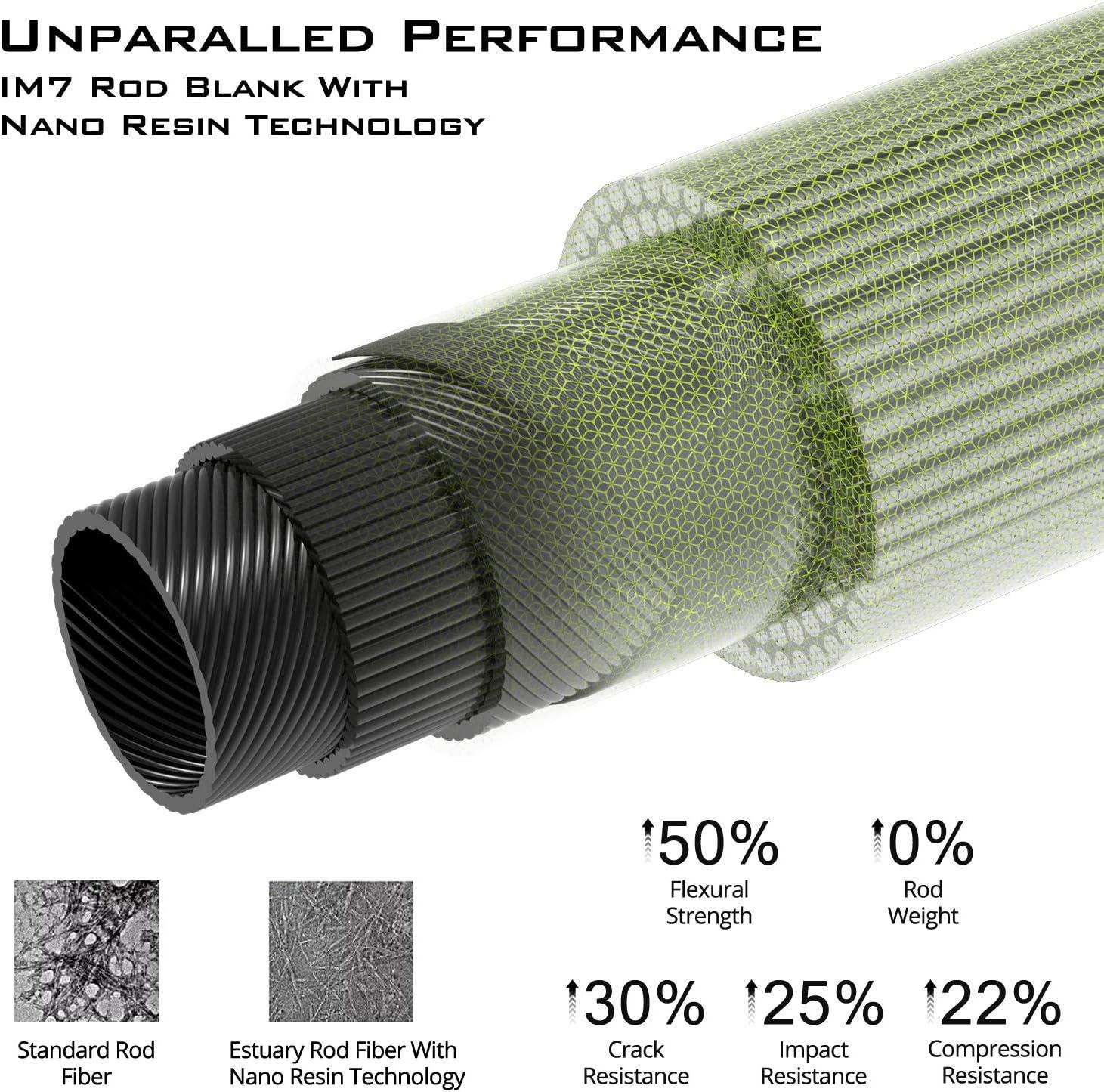 Toray IM7 Graphite Blanks – Proprietary KastKing KastFlex technology fishing rod blanks are designed with exceptional 30 million modulus graphite Toray carbon fiber, providing superior strength and amazing sensitivity. Nano Resin technology is used to deliver an even higher strength to weight ratio and increases rod blank strength by 22% and keeps weight to an absolute minimum.