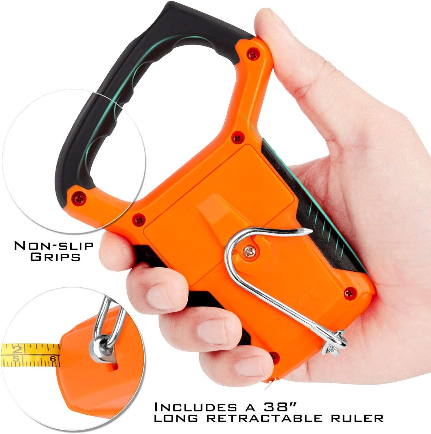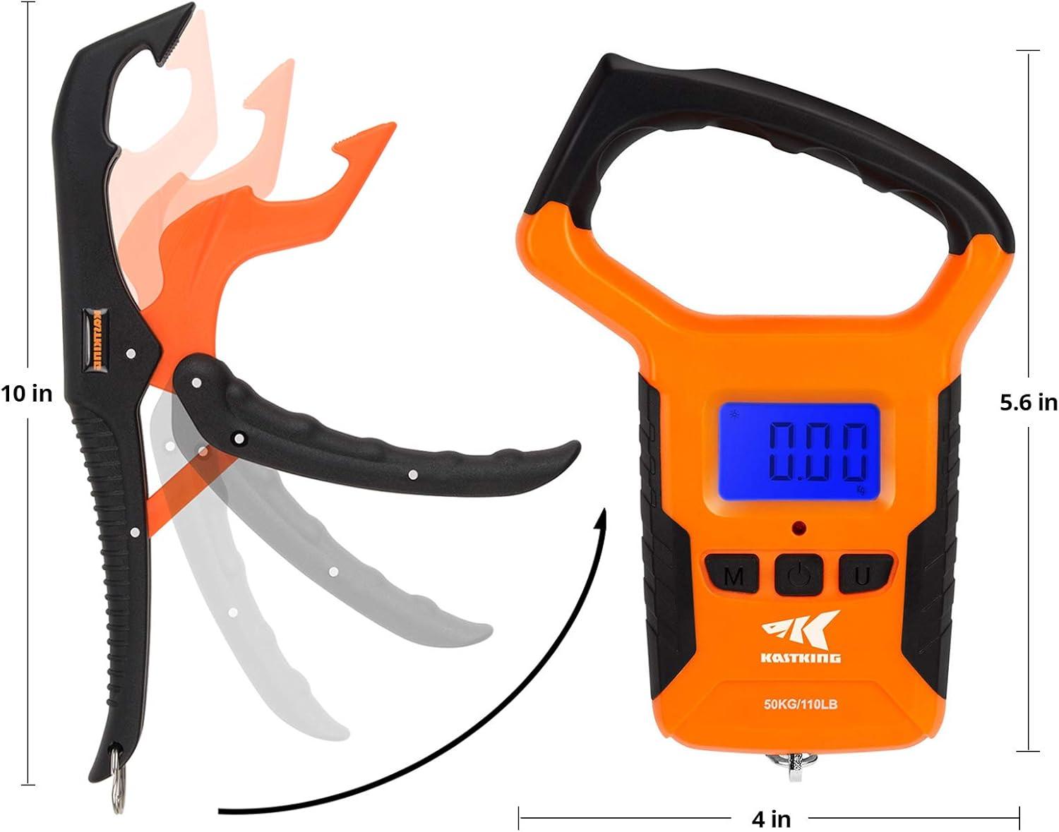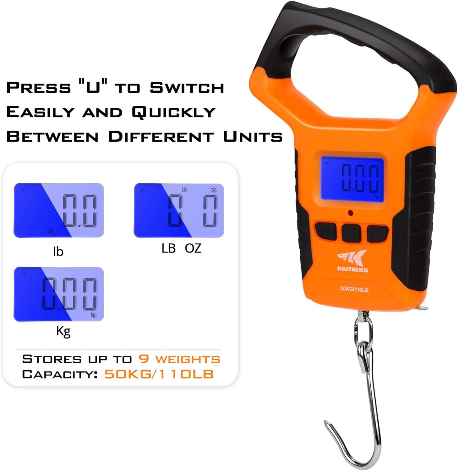 Water-Resistant Digital Scale w/Ruler –KastKing Digital Scale w/Ruler is the true accurate scale, to 1/10th of a pound up to 110 lbs/50KG. Including a 38” retractable tape, it allows you to weigh a fish and measure its length at the same time. Also, the water-resistant digital scale is more than just a fishing scale. Use it to check luggage weight, for shipping packages, around the home and more.