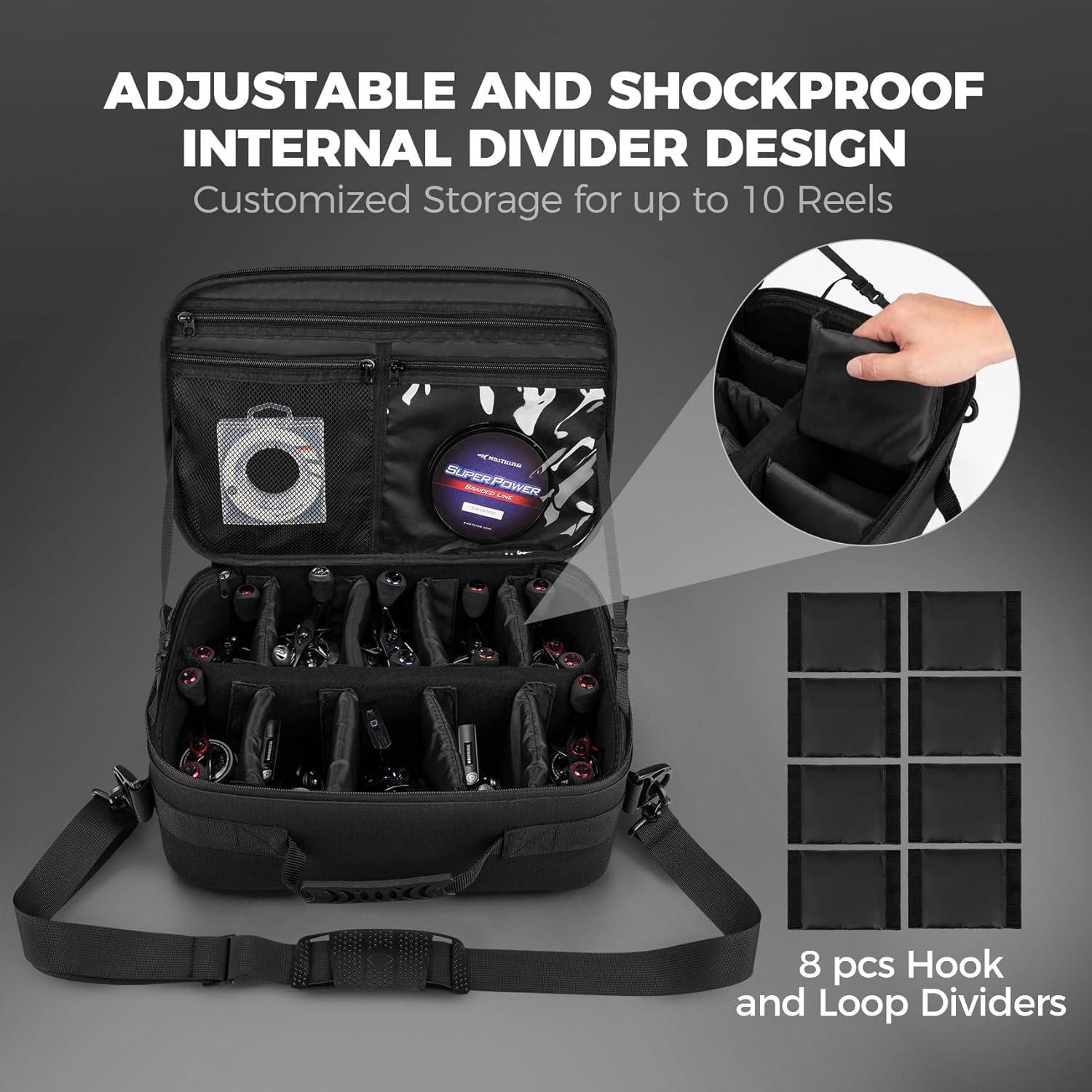 Rigid Structural Loadmaster System: Constructed from high-density nylon fabric, complemented by a shockproof structural support, shockproof EVA padding, and scratch resistant lining, this system ensures formidable protection and significant load-bearing capacity. Incorporating tough, water-resistant materials ensures your fishing reels remain dry and safeguarded against the elements.
