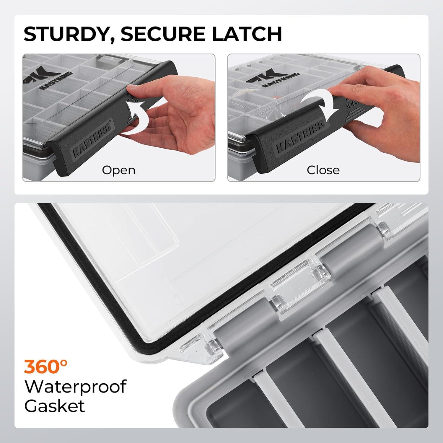 Waterproof and Secure: The HyperSeal Tackle box is fully waterproof to prevent rust. It is shock and wear-resistant, and its sturdy frame with a heavy-duty locking latch prevents moisture from entering and protects fishing gear. The sealing ring attached to the lid effectively waterproofs lures, hooks, and other accessories, keeping them dry and safe.