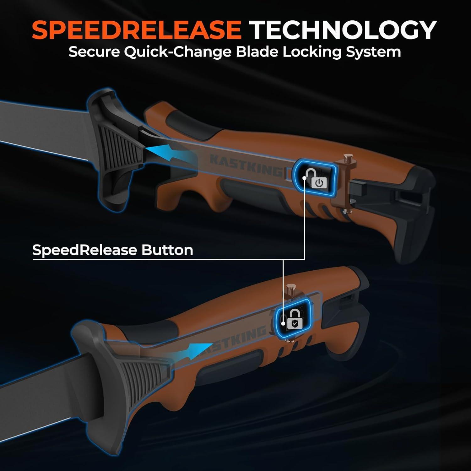 SpeedRelease Quick-Change Blade System: Equipped with the innovative SpeedRelease system, this fishing knife allows for quick and safe blade changes with just a push of the spring-loaded SpeedRelease button. The unique tapered blade to handle interface securely locks the blade into place for safe operation ensuring stable and secure use. The Reinforced Finger Guard not only enables easy blade installation and removal, but also helps to prevent injuries.