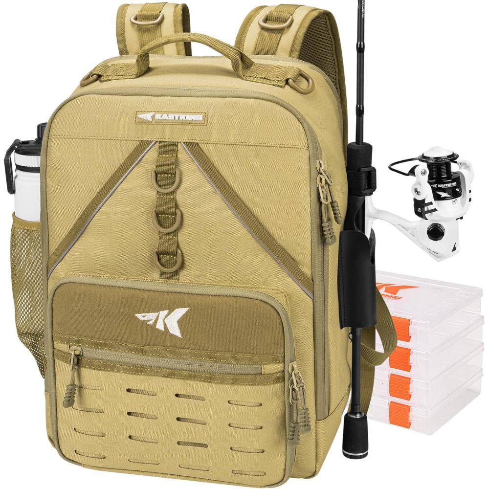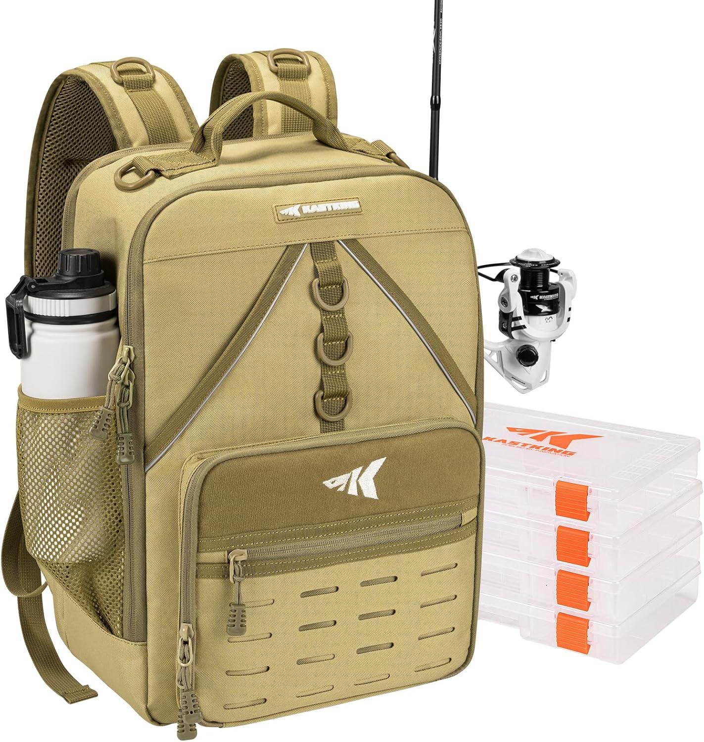 KastKing KarryAll Fishing Tackle Backpack with Rod Holder 4 Tackle Boxes,40/26L Tackle Bag Storage Fishing Gear and Equipment(E: Medium (26 L) – Khaki)