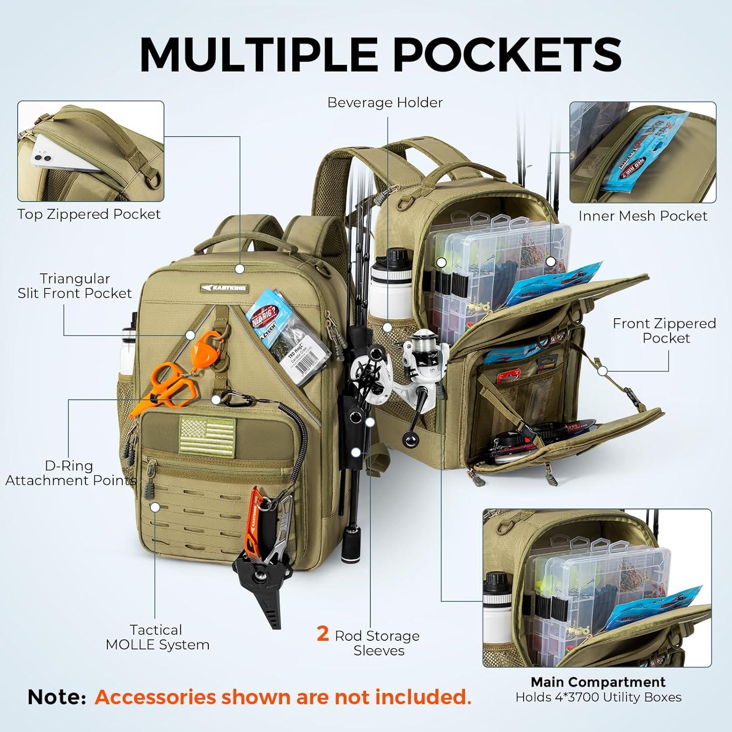 KastKing KarryAll KastMate Fishing Tackle Backpack,Water-Resistant Tackle Bag With 2 Rod Holders,Fishing Gear and Equipment With Large Gear Storage,Black(C: Khaki)