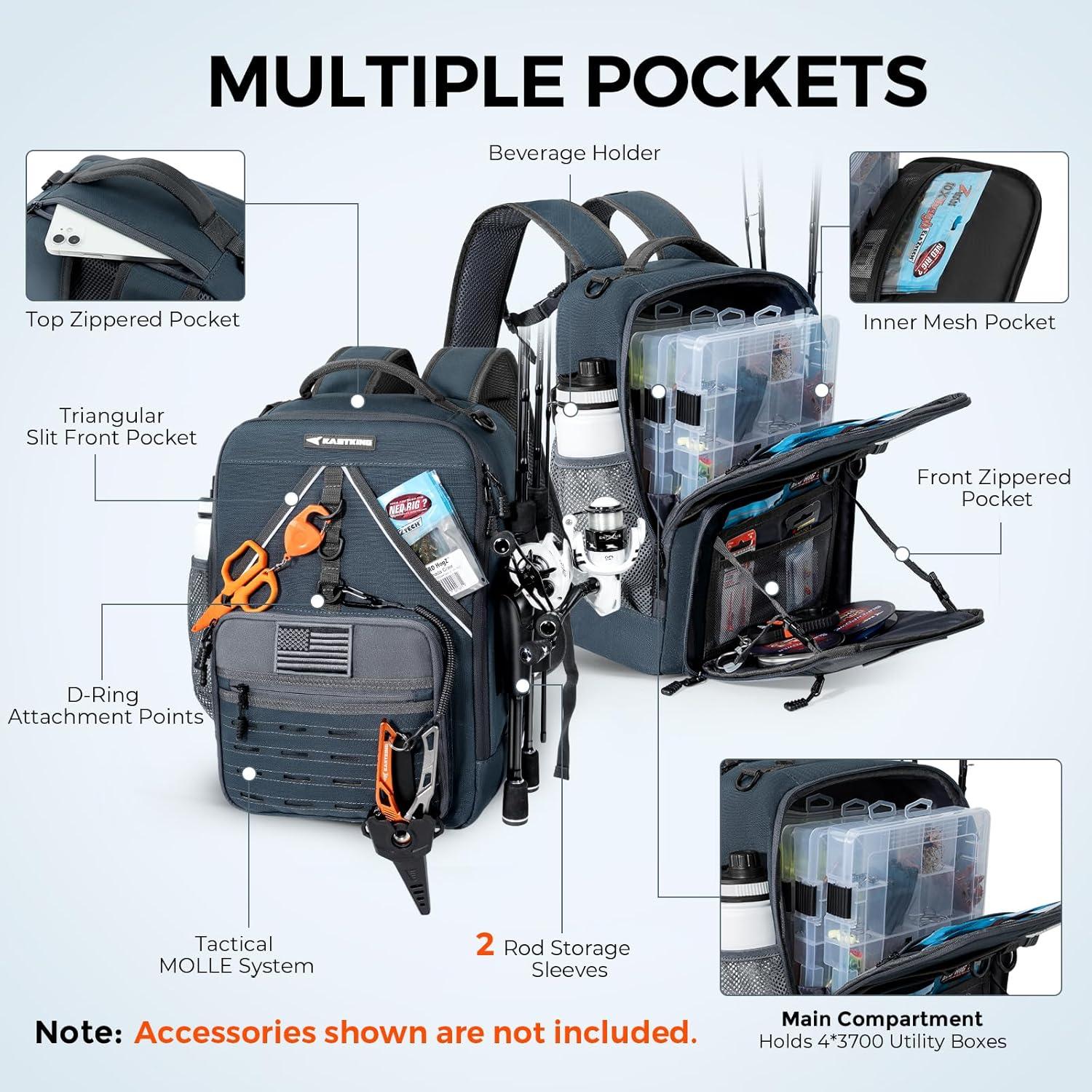 Organize Your Gear – The KastKing KarryAll KastMate Fishing Tackle Backpack offers a smart multi-pocket layout to keep your gear organized. The spacious main compartment fits up to 4*3700-size utility boxes, while an inner mesh pocket holds soft bait bags. A top zippered pocket is ideal for your phone. Additional storage includes a large front zippered pocket, a triangular slit front pocket, 2 rod storage sleeves, a beverage holder, D-ring attachment points, and a MOLLE system.