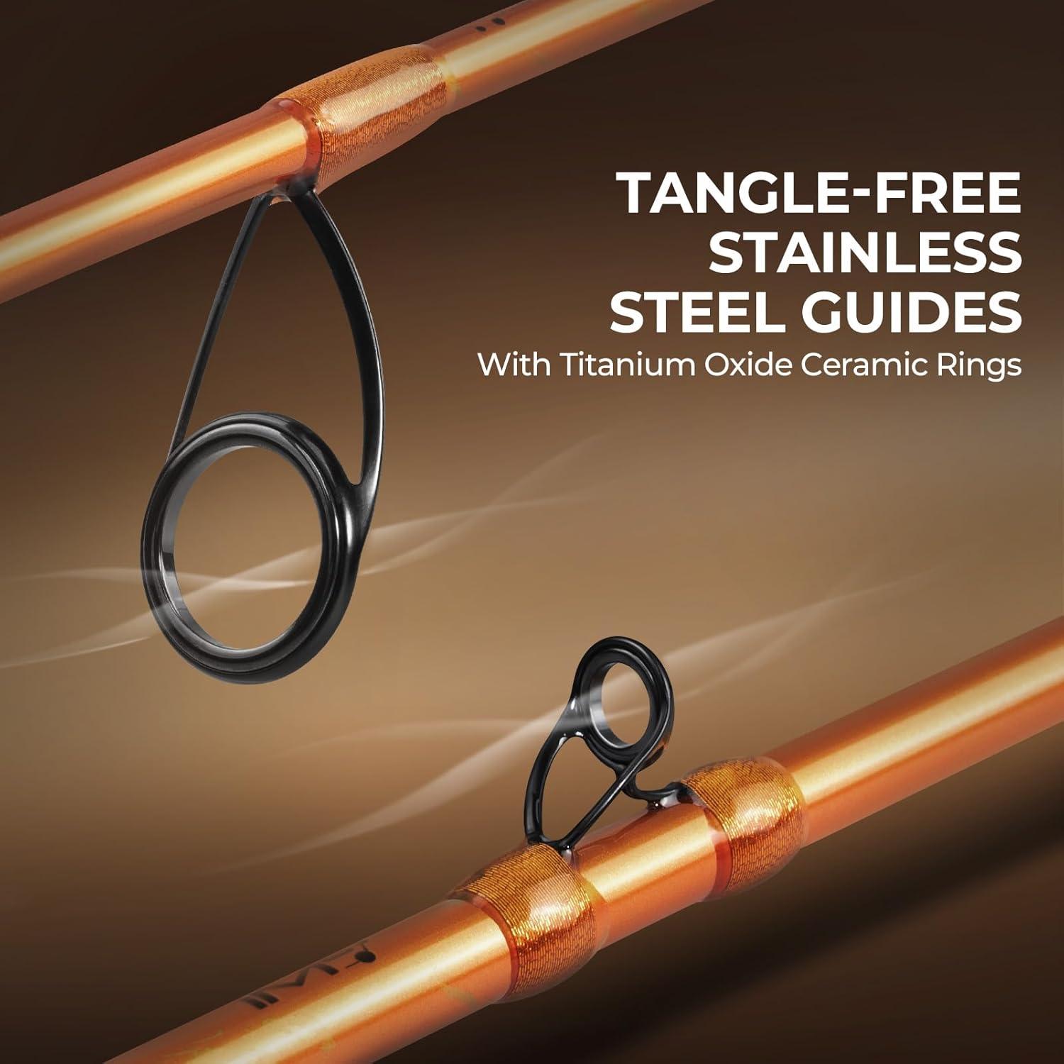 Smooth, Long-distance Casting – No-tangle stainless steel guide frames with titanium oxide ceramic rings reduce friction for longer, more accurate casts. They work perfectly with monofilament, fluorocarbon, or braided fishing line. Custom reel seats, EVA handles, and built-in hook keeper ensure a secure and convenient grip, enabling anglers to fish for extended periods without fatigue or interruption.