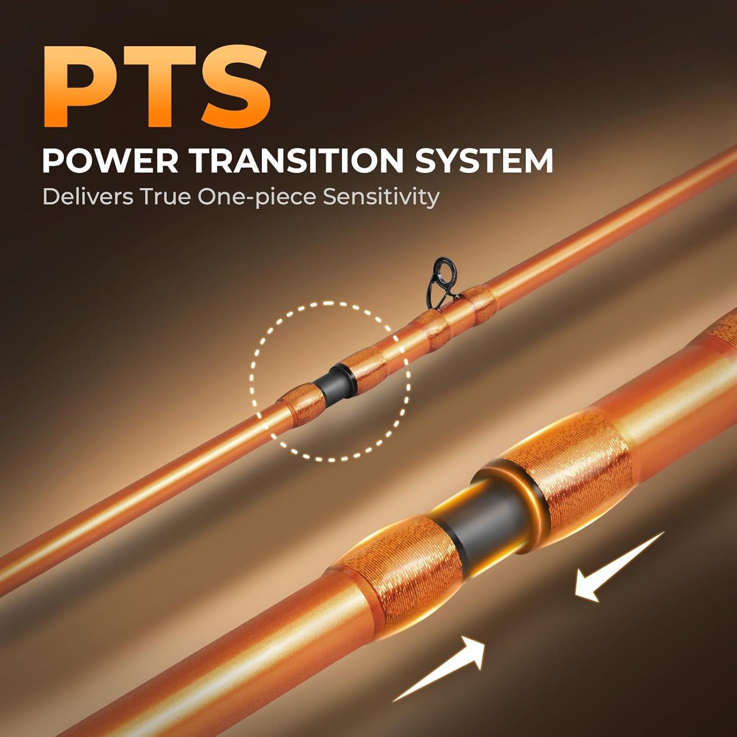 High Sensitivity 2-piece Fishing Rod – Premium KastFlex IM6 graphite blanks give exceptional bite detection for bass fishing, trout fishing, walleye fishing, and more. The Power Transition System (PTS) delivers the seamless sensitivity of a one-piece rod with the convenience of a 2-piece design for easy transport. Includes extra matching tip section for backup.