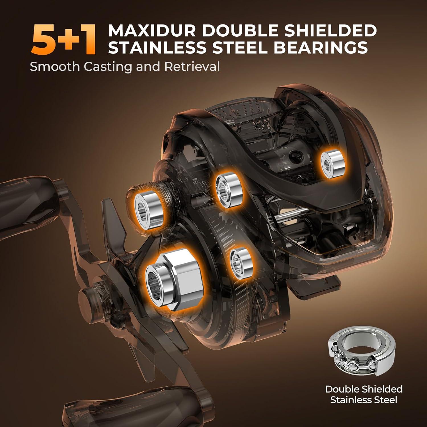 Baitcasting Combo with Speed & Control – Low-profile Palm Perfect 41mm KastKing Lethal Blaze Baitcasting Reel with a 7.3:1 gear ratio for quick lure retrieval or working slower baits. Features 5+1 MaxiDur double-shielded stainless steel ball bearings, precision brass main gear, magnesium brass pinion gear, and an 11-setting magnetic braking system for smooth casting control. It also includes a convenient line indicator to help you monitor your spooled line weight.