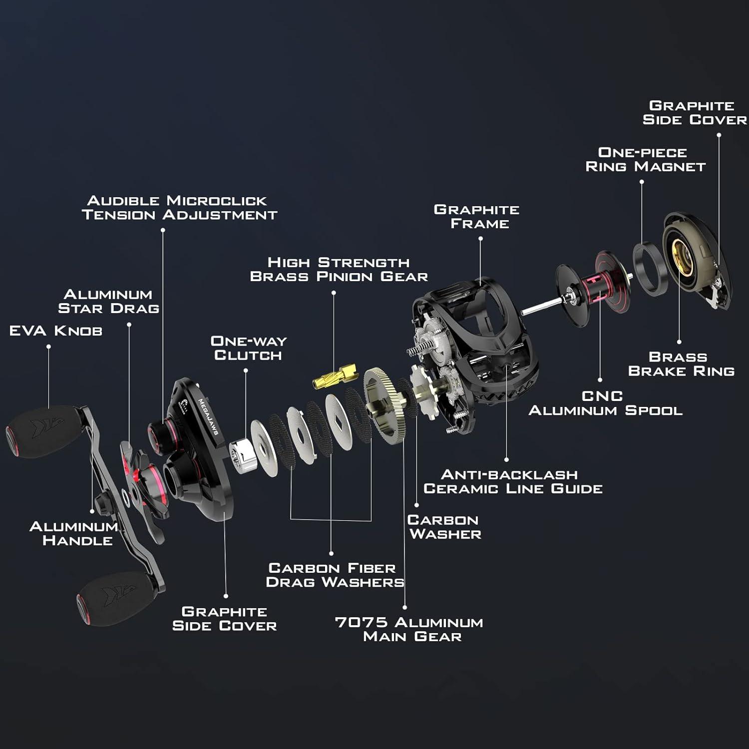 PALM PERFECT – LIGHTWEIGHT DESIGN – Upgraded MegaJaws baitcasting reel, adopting KastKing Palm Perfect ergonomic engineering, are only 41mm tall and much lighter than before. MegaJaws baitcaster reel total weight only 6.7oz on the new model. Main gears and main gear shafts are made of hardened aerospace 7075 aluminum. Pinion gears are super hard manganese brass. Grips were changed from rubber cork to comfortable, lightweight EVA. MegaJaws baitcasting reel lets you fish longer with less fatigue