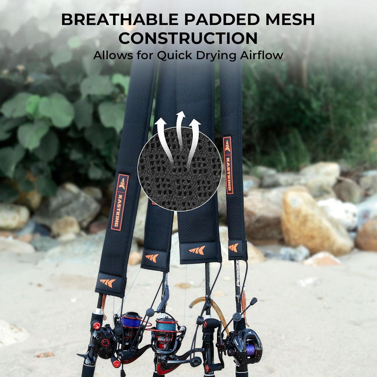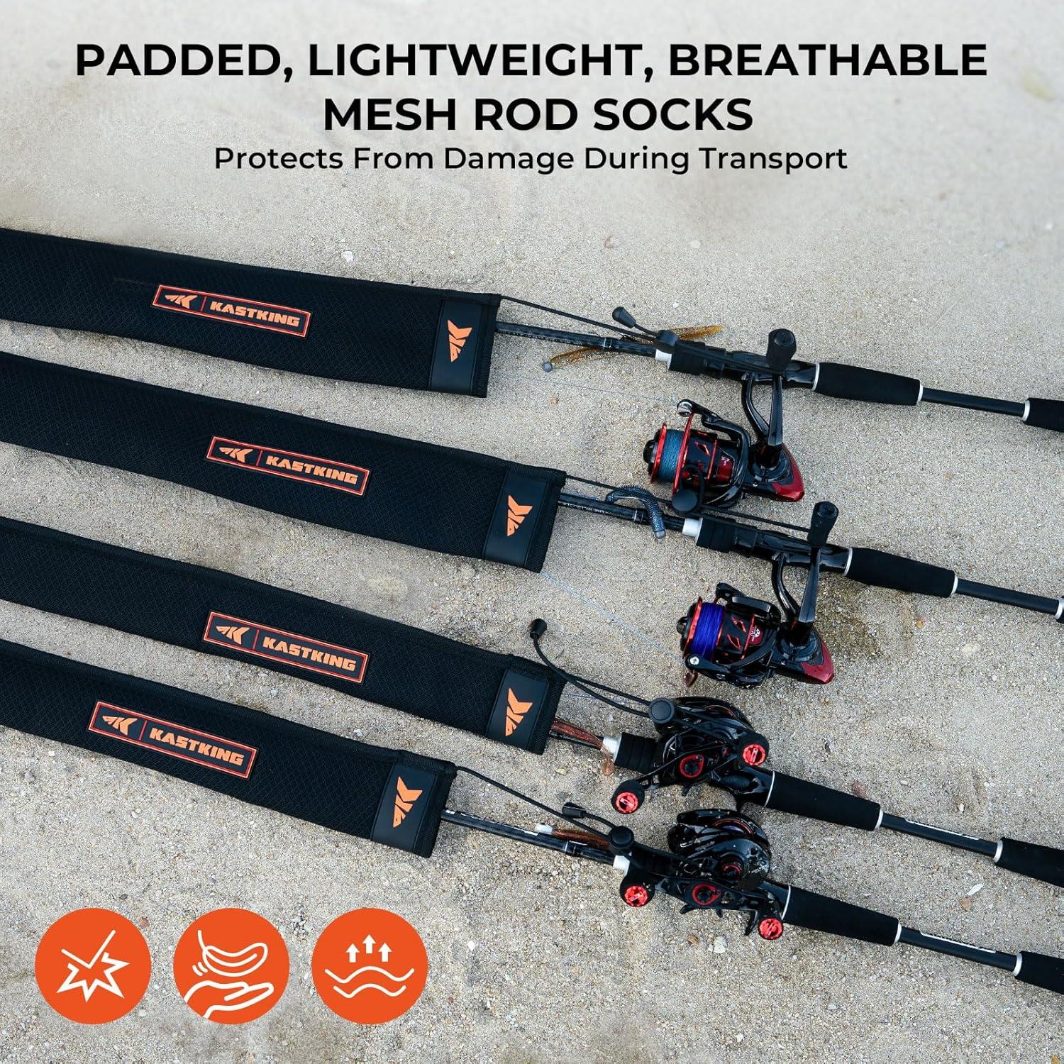 Thick Padded Mesh Rod Covers: Designed to protect your fishing rods, these covers feature approximately 3mm thick mesh padding that provides both breathability and reliable impact protection. Whether you’re bundling multiple rods or a single rod, KastKing MeshGuard Rod Socks shield your gear from damage during transportation giving you ultimate protection of your expensive equipment.