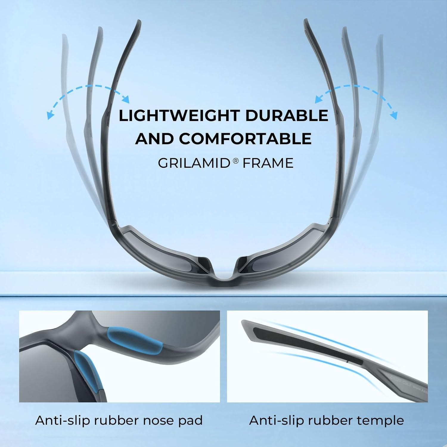 KEY FEATURES – Polarized lenses reduce glare – Impact resistant TAC lenses protect your eyes from flying objects – Lightweight, durable, and comfortable Grilamid frames – Anti-slip nose and temple pads – Block 100% of the harmful UVA and UVB rays – Full wrap design for maximum protection