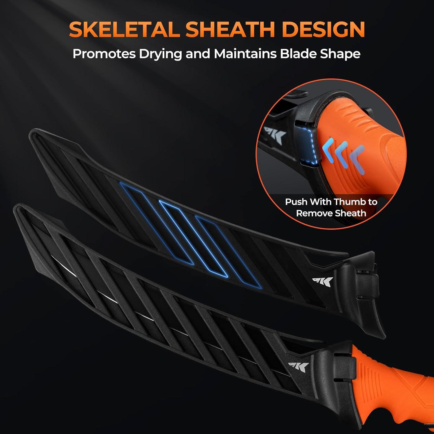【Innovative Sheath Design】The knife comes with a custom vented skeletal sheath that allows quick air drying, maintaining the blade's sharpness. The bait shears come with a custom molded sheath for blade protection.