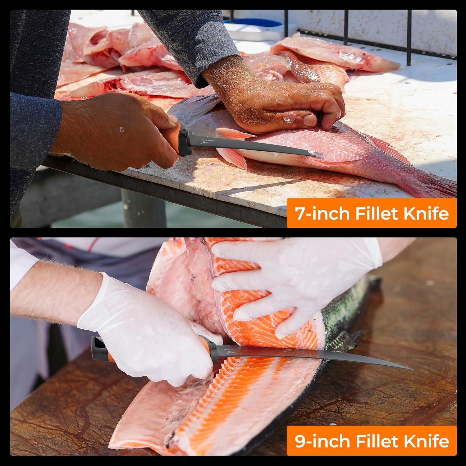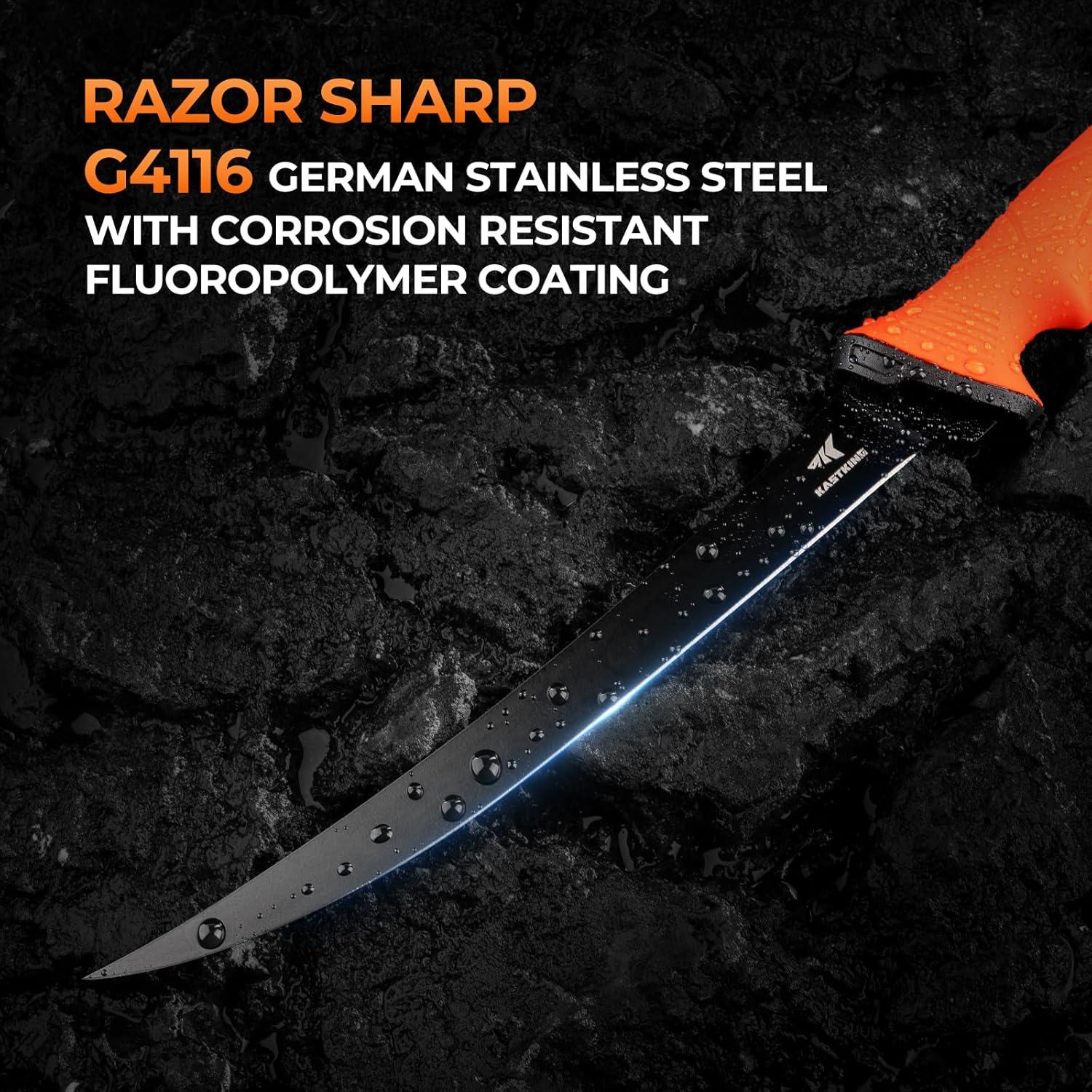 【Precision Fillet Knife】The 9-inch fillet knife, made with G4116 German stainless steel and a durable polymer coating, offers the ideal flexibility for precise filleting, suitable for larger, fresh, or saltwater fish.