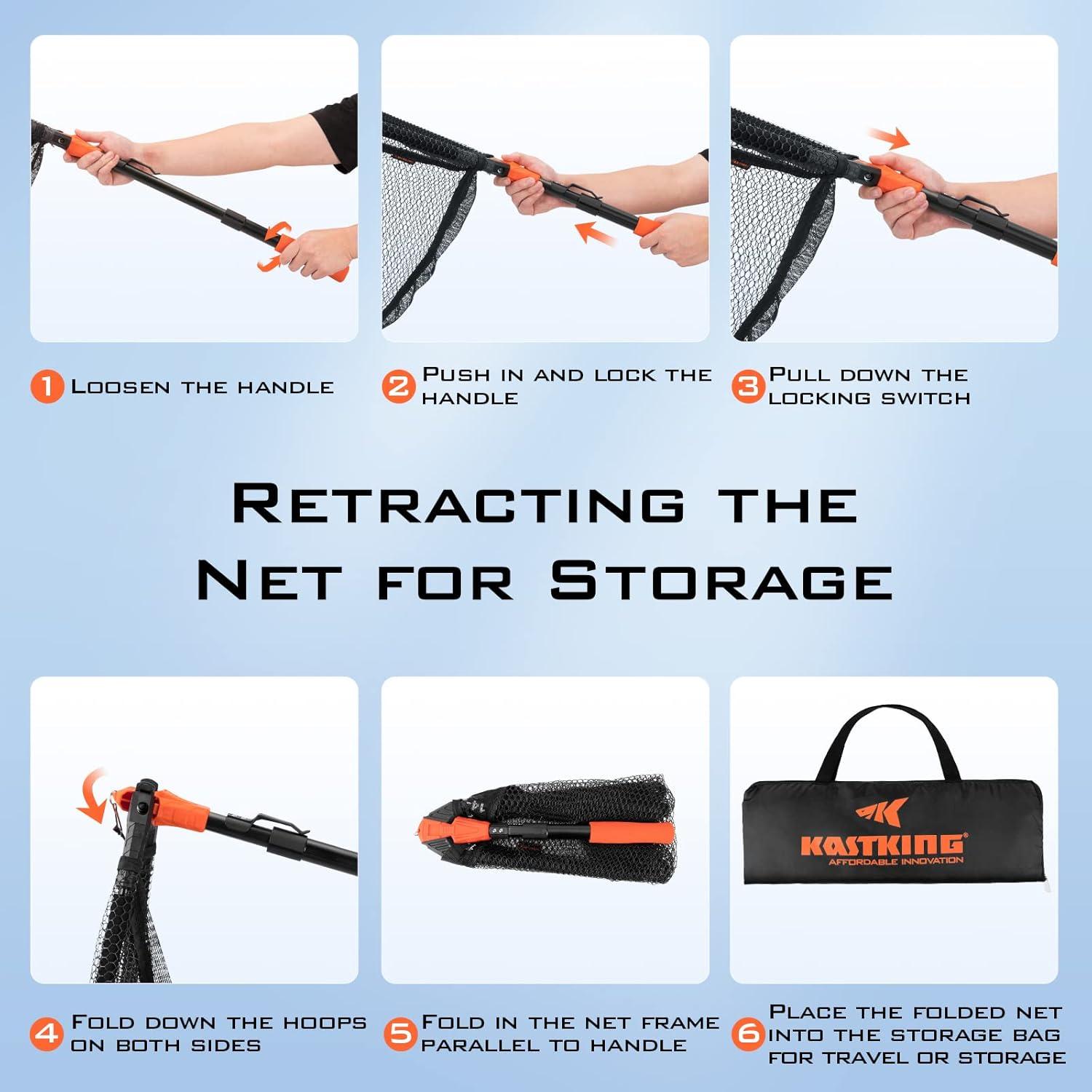 Foldable & Retractable: Using a triangle-shaped design net hoop, the KastKing Pontus landing net features a push-down switch for convenient storage. Quickly and easily pull down the release button to fold the net frame. In addition to the retracting handle, the net frame folds to reduce the size for easy storage and transportation.