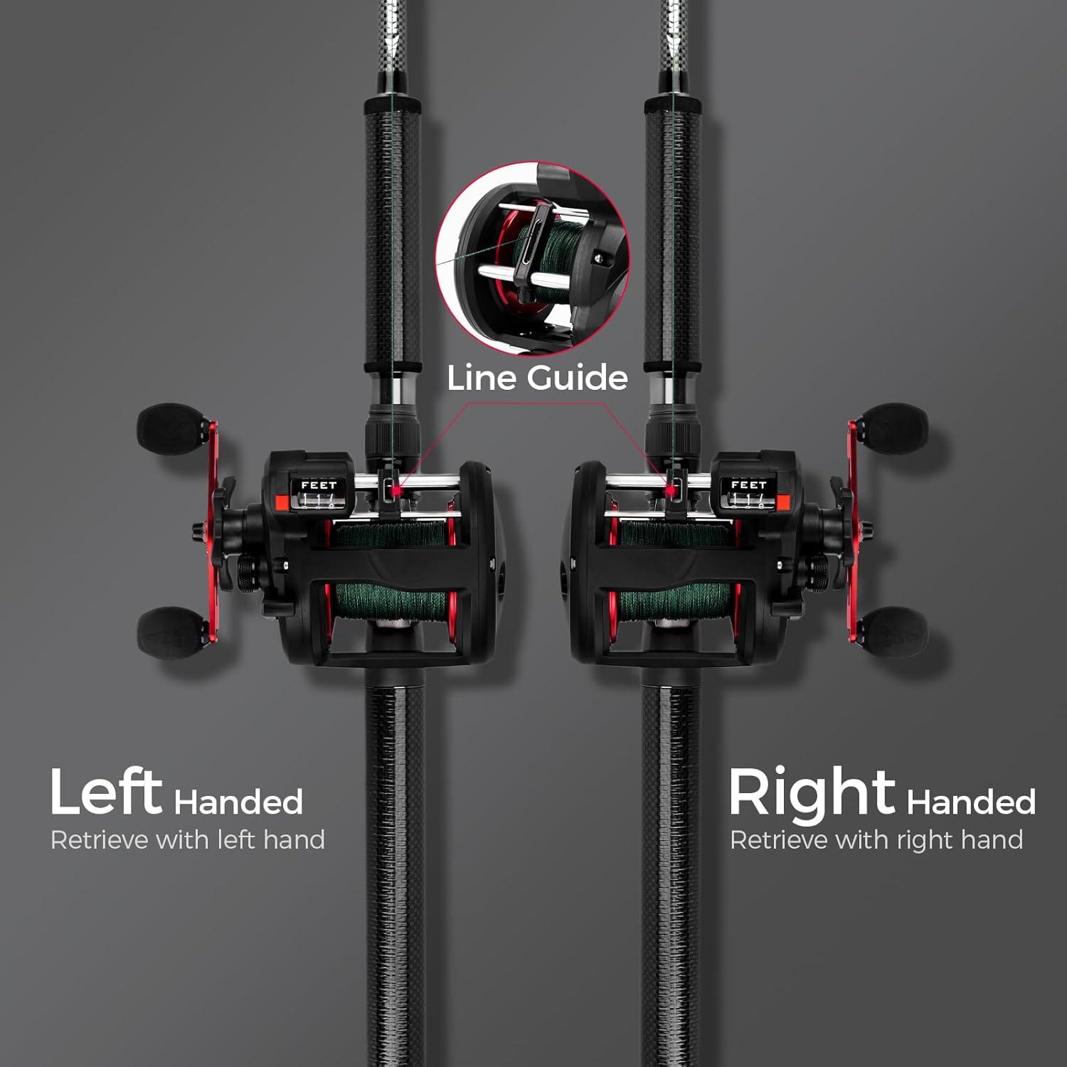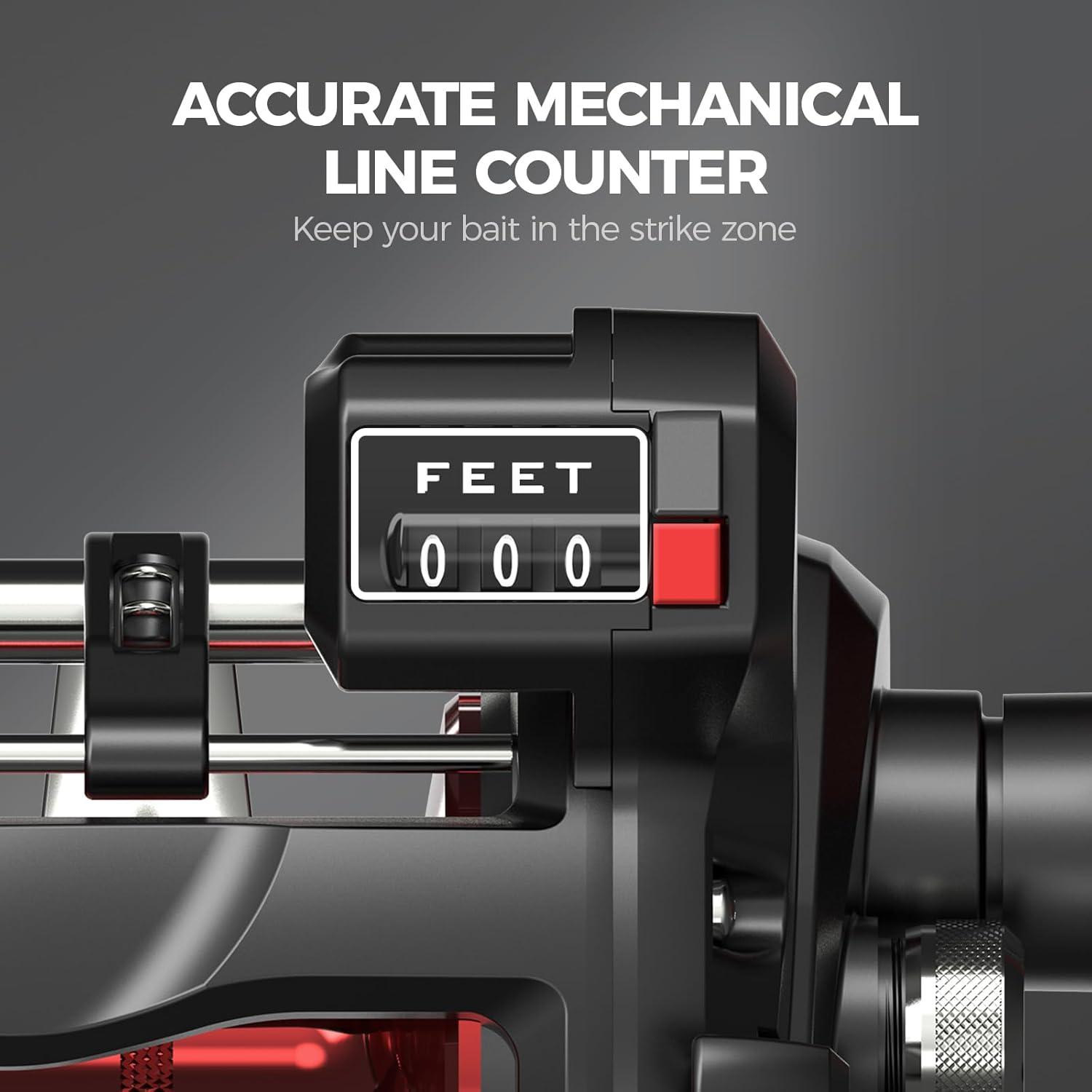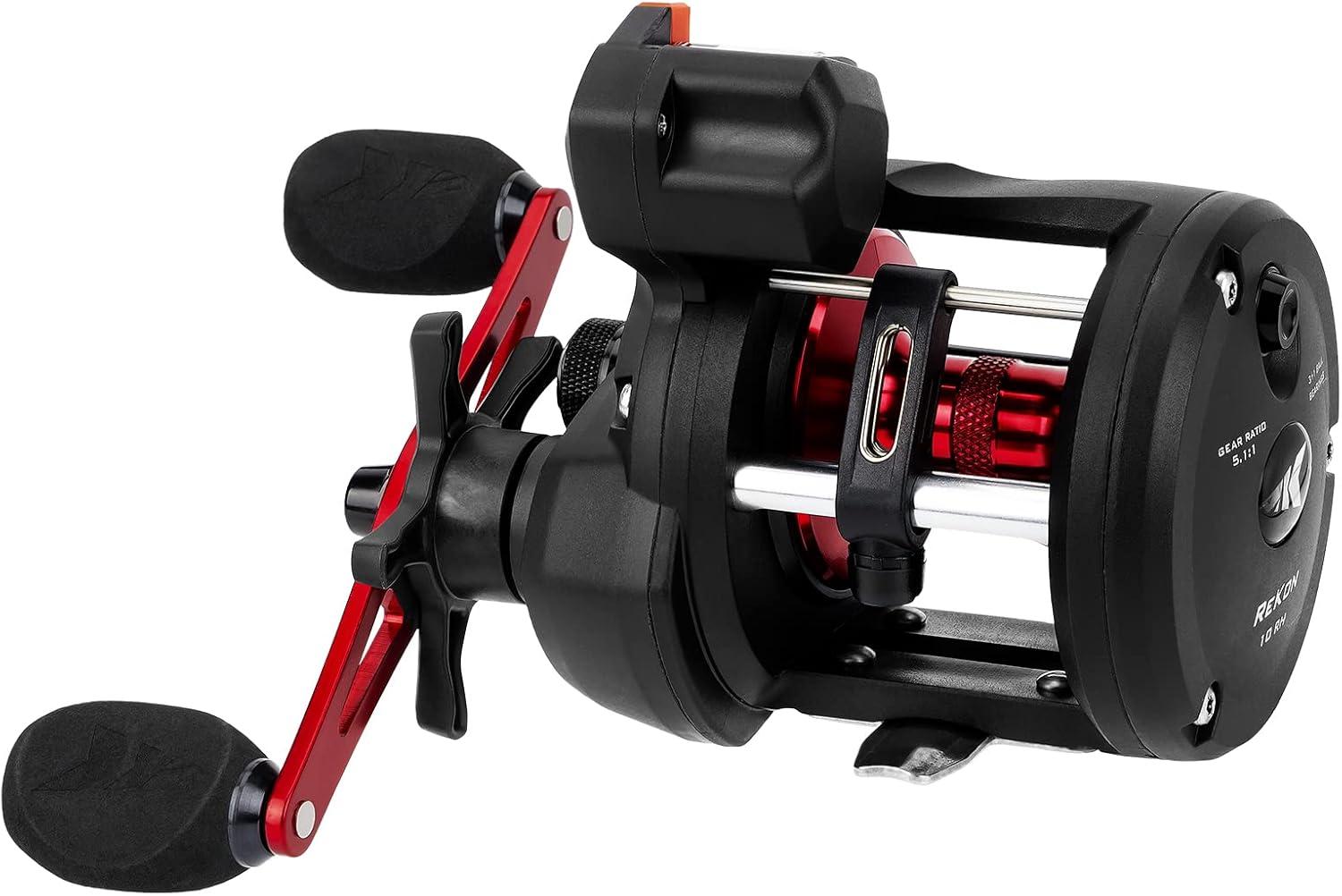 AMAZING DRAG POWER & FEATURES – The ReKon Line Counter round casting reels use a smooth, carbon disc drag that delivers 30 lbs of fish stopping power (25lb for size 10). Both size reels have a line clicker function that makes releasing planer boards simple and easy. You can use that feature as a strike detection system while trolling. Gear ratio is 5.1:1 on the size 10, 5.3:1 on the size 20 and 4.5:1 on the size 30.