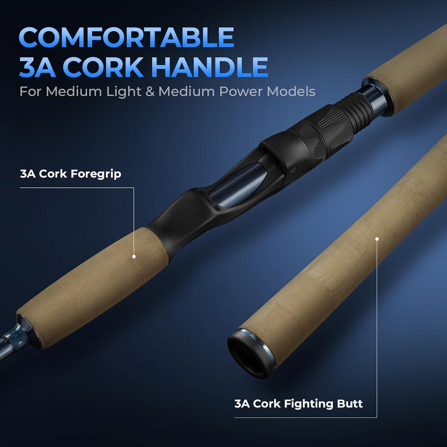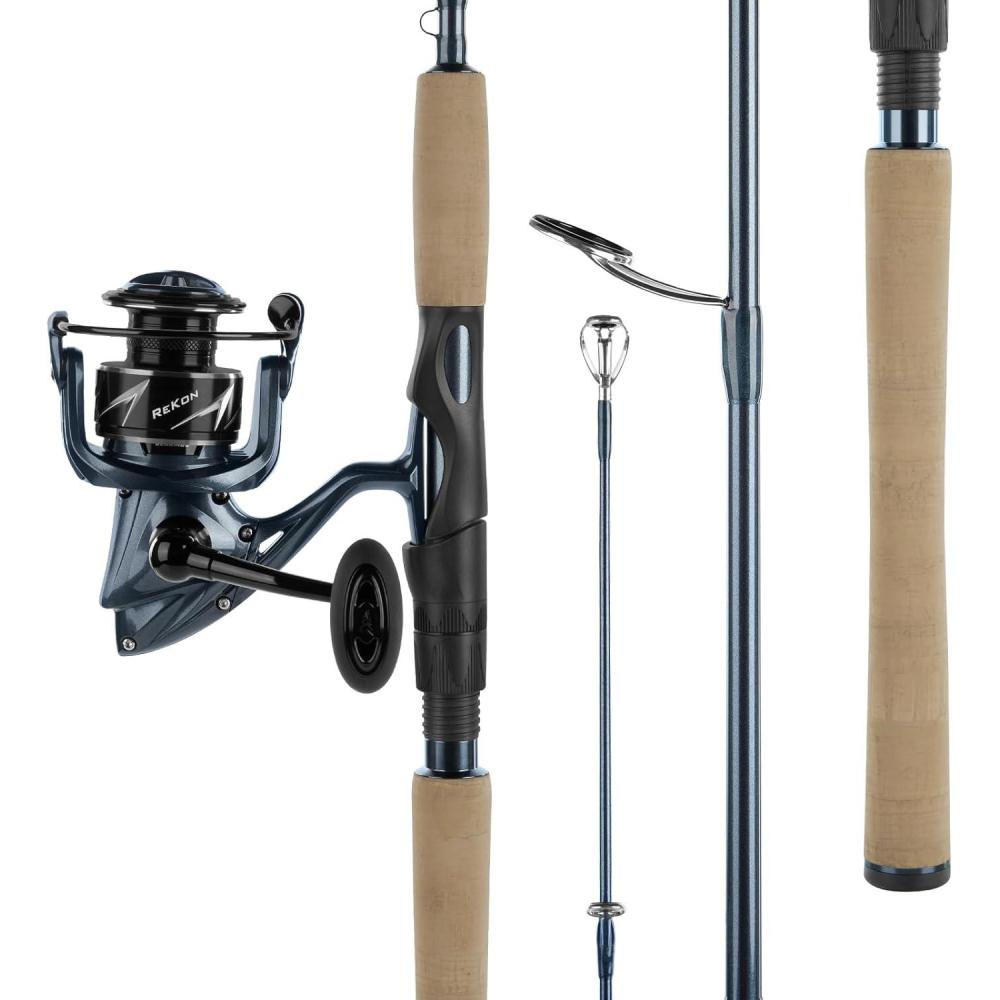 Innovative Design – The lighter ReKon spinning rod features comfortable 3A cork handles, while the larger model is equipped with slip-resistant EVA handles. The rod also includes a large fighting butt and an extended foregrip for battling big fish. The stainless steel guide with zirconia rings ensures smooth line flow, while the graphite uplock reel seat firmly holds large reels, even under the strain of powerful fish.