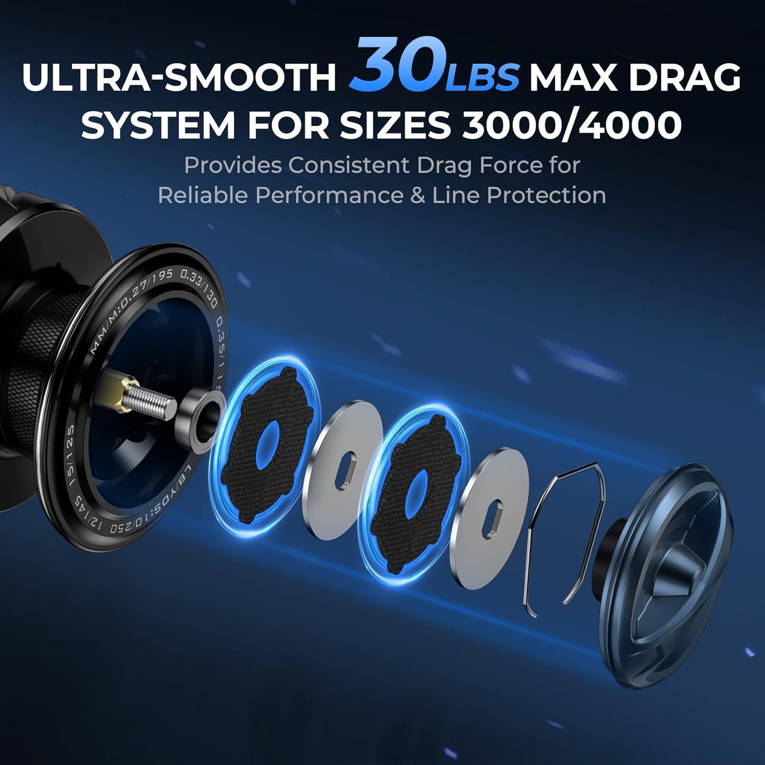 Unrivaled Drag Power & Durability – The KastKing ReKon Saltwater Rod & Reel Combo combines versatile drag and high-strength components for ultimate performance. Sizes 3000/4000 feature a 30 lb double-disc carbon drag, while size 5000 delivers 40 lbs with a triple-disc system. With a durable manganese brass pinion gear, hardened brass main gear, and reinforced stainless steel main shaft, this fishing rod and reel combo is built to conquer tough saltwater conditions.