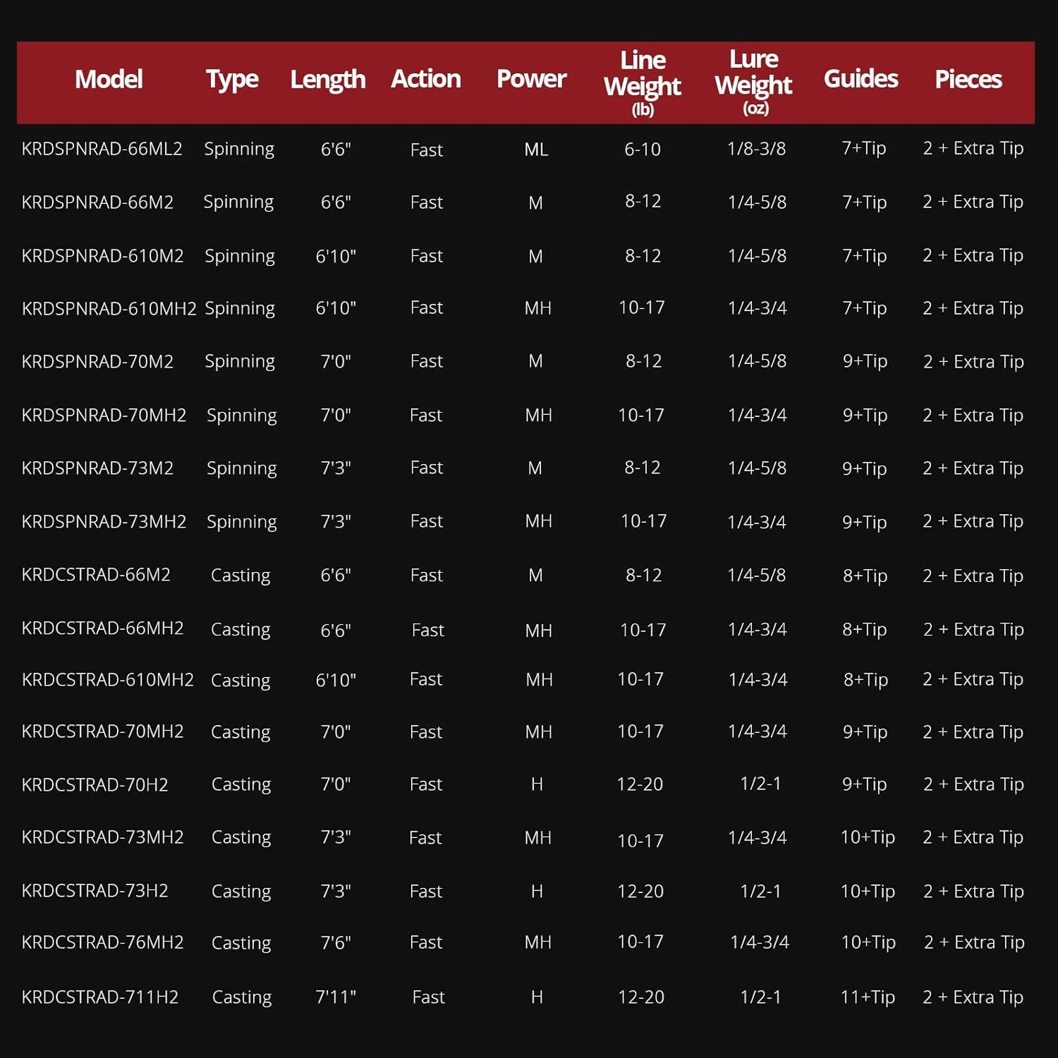 17 Different Rods: The KastKing Royale Advantage Twin Tip Fishing Rods range of 8 spinning and 9 casting rods. With such a diverse selection, you can be certain that these fishing rods will meet to your different needs.