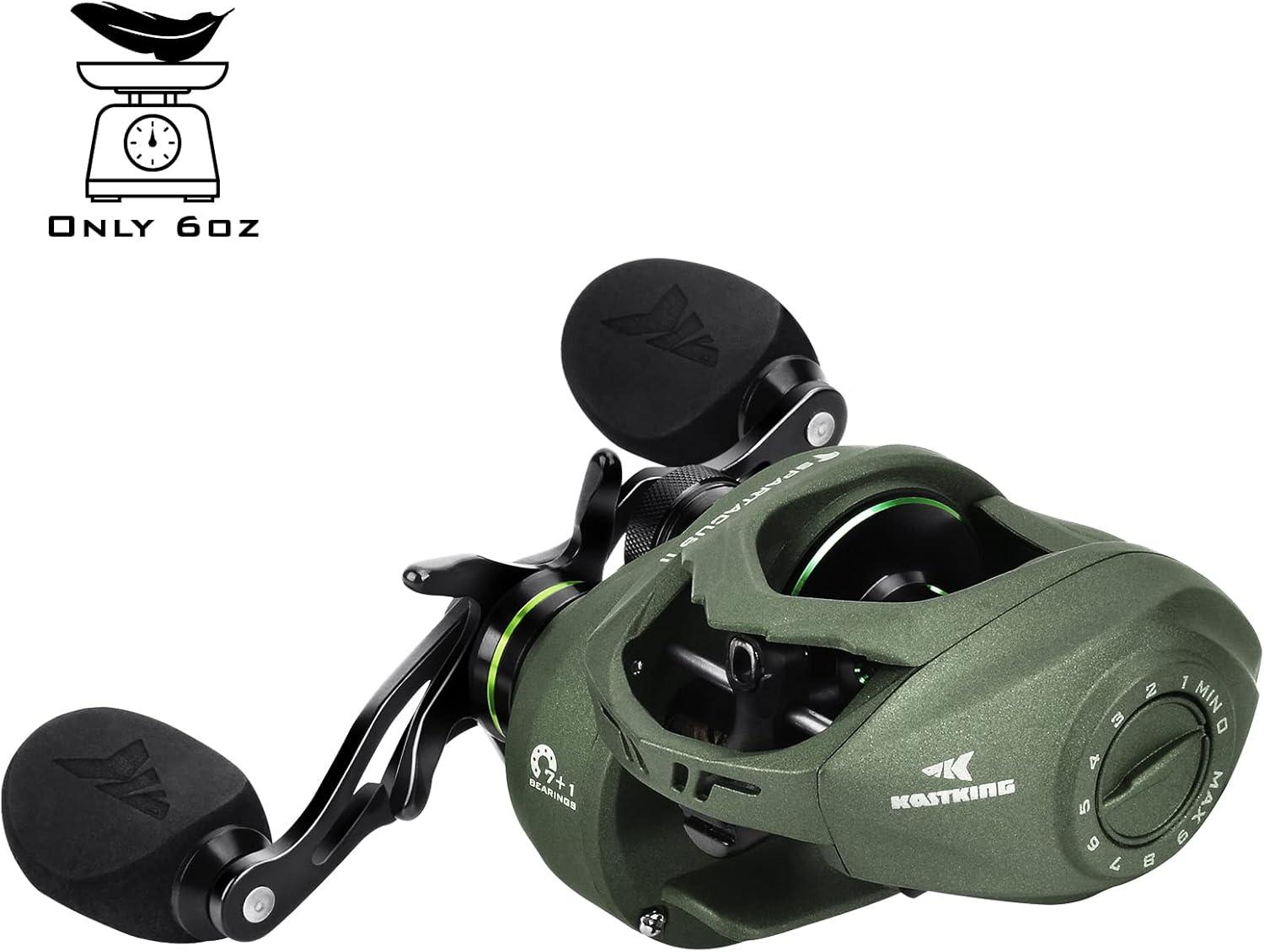 Smooth – A Spartacus II bait casting reel has: superior shielded 7 + 1 corrosion-resistant ball bearings, CNC anodized aluminum spool with power launch and aluminum handle for smooth casting, powerful precision machined hardened aluminum main gears, and KastKing logo embossed hi-grade EVA handle knobs. With an aluminum main gear, the reel is only 6 oz.