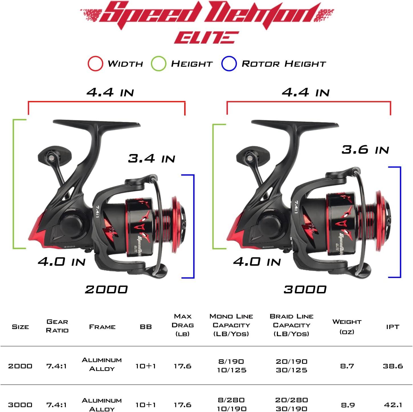 EXTREME HIGH SPEED DESIGN – The NEW KastKing Speed Demon Elite Spinning Reel 7.4:1 gear ratio offers you spectacular, fastest on the planet retrieve speed and line pick up. Size 2000 has 38.6 IPT and 3000 has 42.1 IPT. Get your fish or bait back to the boat fast and cast again. Important for fast paced bass fishing tournament action. Speed Demon Elite spinning fishing reels are designed for competition and engineered for the win!
