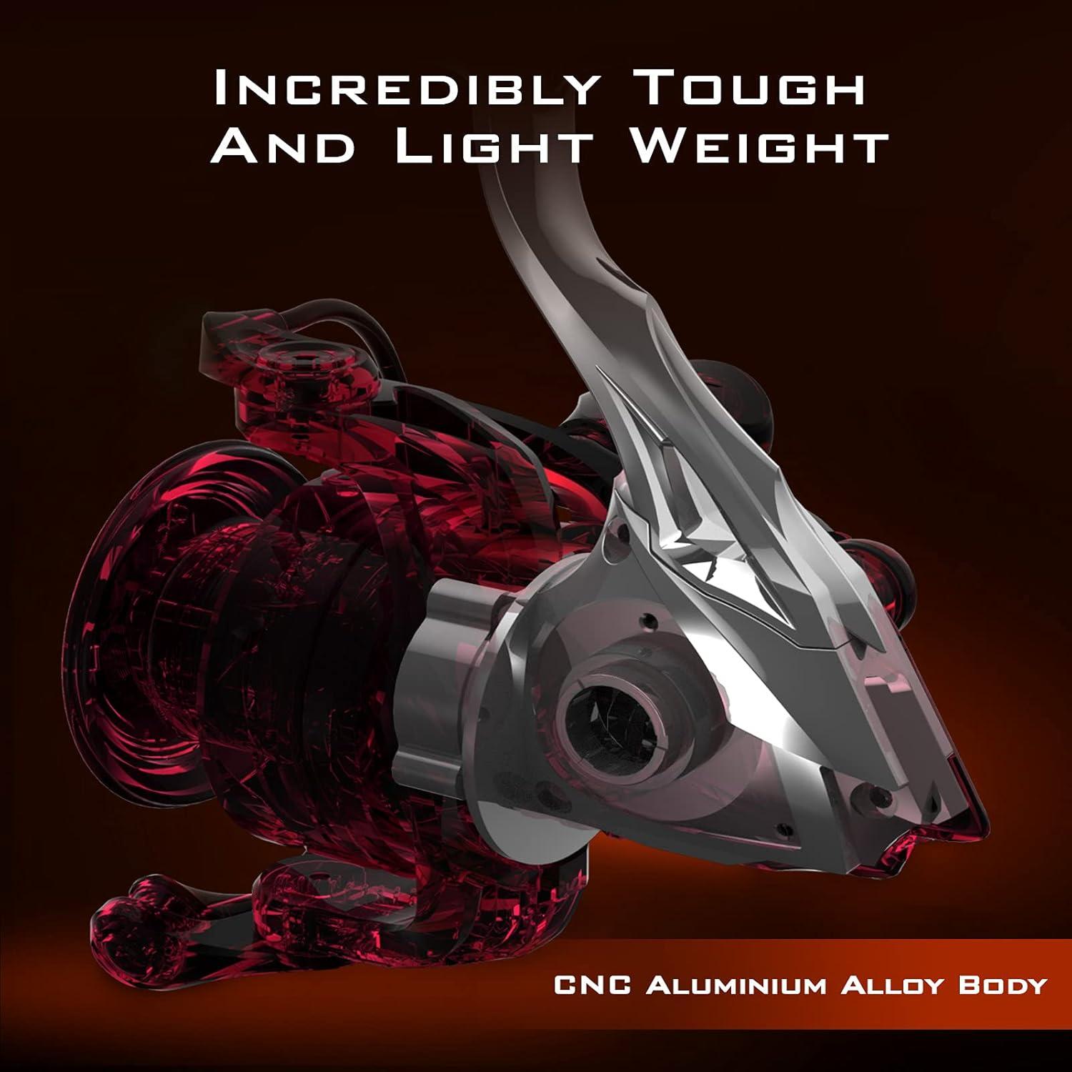 SPECTACULAR TOUGHNESS & LIGHT WEIGHT – A KastKing Speed Demon Elite spinning fishing reel has a high-strength CNC machined aluminum alloy body and body covers to virtually eliminate frame twist. KastKing takes weight reduction a step further with a 7075 aluminum main gear, carbon fiber rotor and CNC aluminum handle with EVA handle knob. Size 2000 weighs only 8.7 ounces and size 3000 is a mere 8.9 ounces, even lighter than graphite reels. Less weight means less fatigue on long fishing trips.