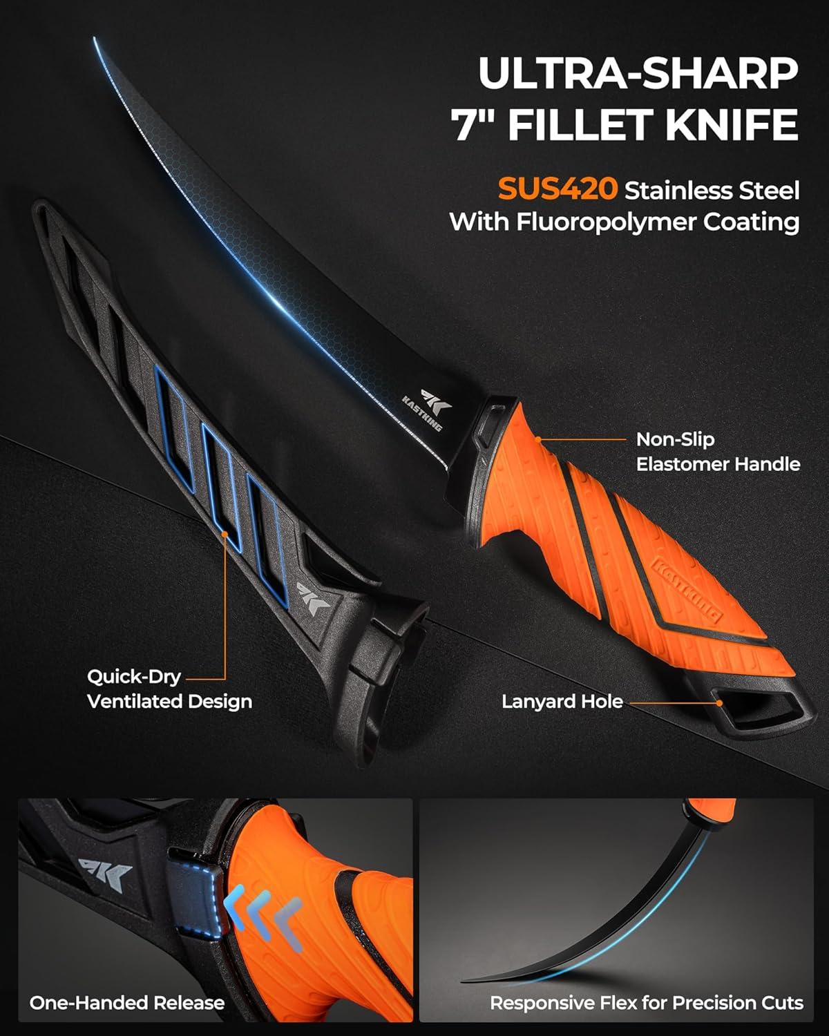 Ultra-Sharp & Flexible 7″ Fillet Knife – Made from SUS420 stainless steel with a fluoropolymer coating, the 7″ fillet knife offers long-lasting sharpness, flexibility, and excellent corrosion resistance. The non-slip TPR handle ensures a firm grip, while the lanyard hole adds carrying convenience. The ventilated sheath helps the blade dry quickly.
