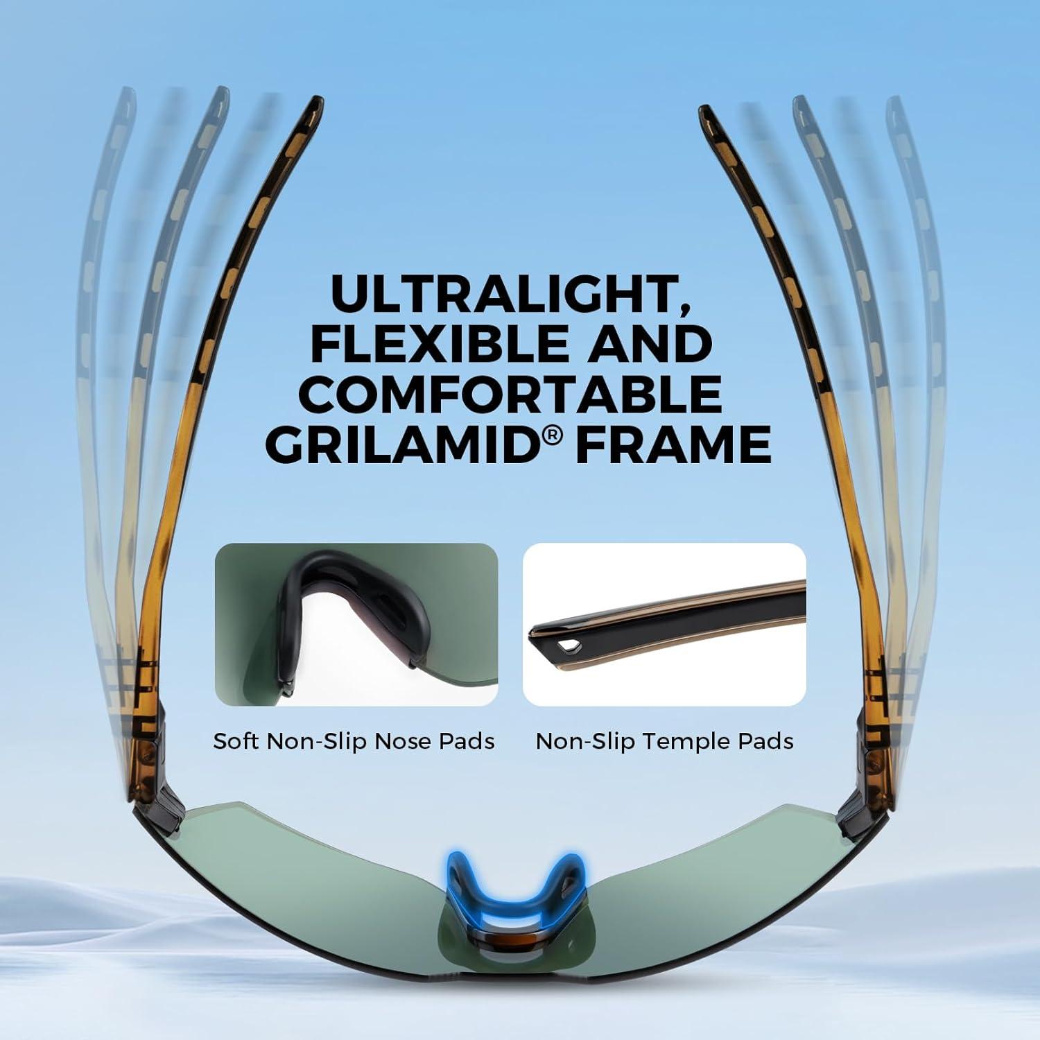 KastKing Tarkio Polarized Fishing Sunglasses, Large Single PC Lenses, Rimless Wrap Design, UV400 Protection Sports Sunglasses(D: Gloss Tal Brown - Silver Frame Chartreuse Mirror)
