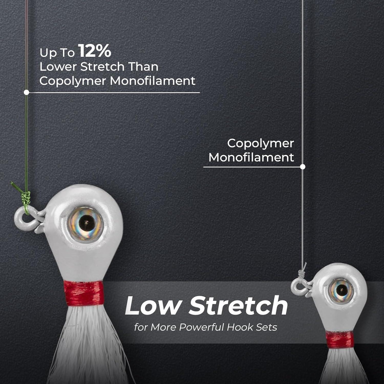 Highly Abrasion Resistant – The mono fishing line exhibits abrasion resistance that exceeds traditional copolymer monofilament and fluorocarbon by up to 2X. Better abrasion resistance allows you to fish heavy structure such as boat docks, submerged brush piles, and rocky bottoms with less concern over line failure. Higher abrasion resistance also equates to greater knot strength which means fewer lost fish due to knot failure.