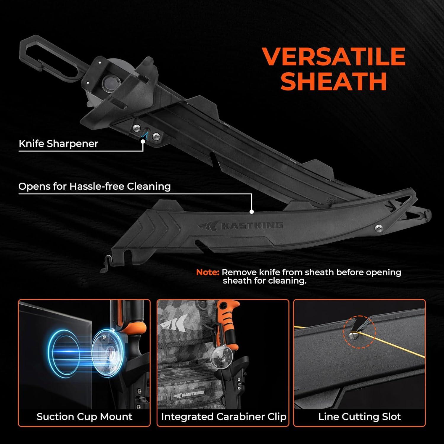 Functional Sheath Design: The sheath is innovatively designed to open fully for easy cleaning, reducing maintenance hassle. It includes a suction cup for secure attachment to boat surfaces, a built-in carabiner for easy transport, and a blade fishing sharpener to keep the fillet knife in top condition