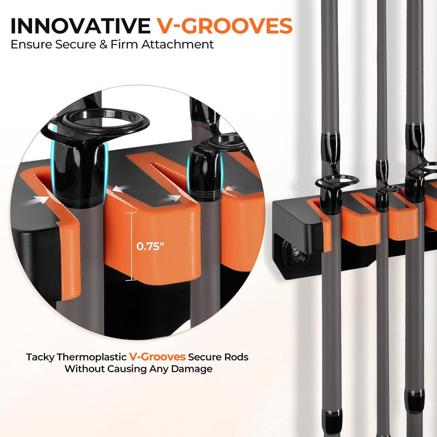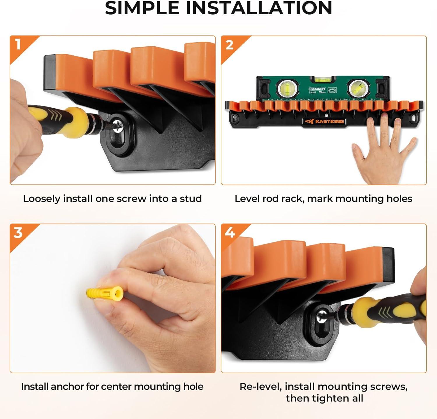 KEY FEATURES : Store up to 15 fishing rods or fishing rod and reel combos in less than 18” of wall space, Innovative Design fishing pole holder is easy to use, Easy installation with only 3 screws