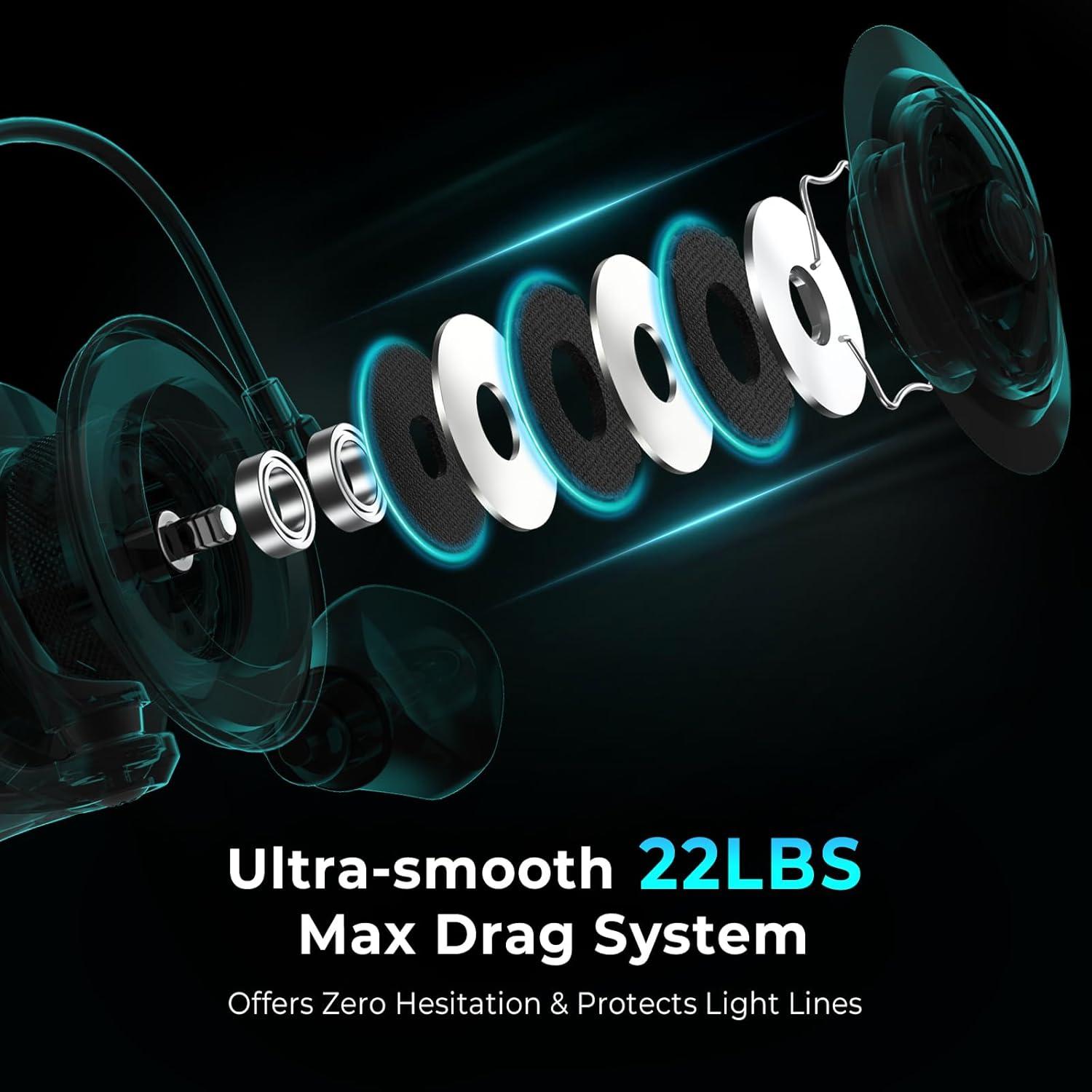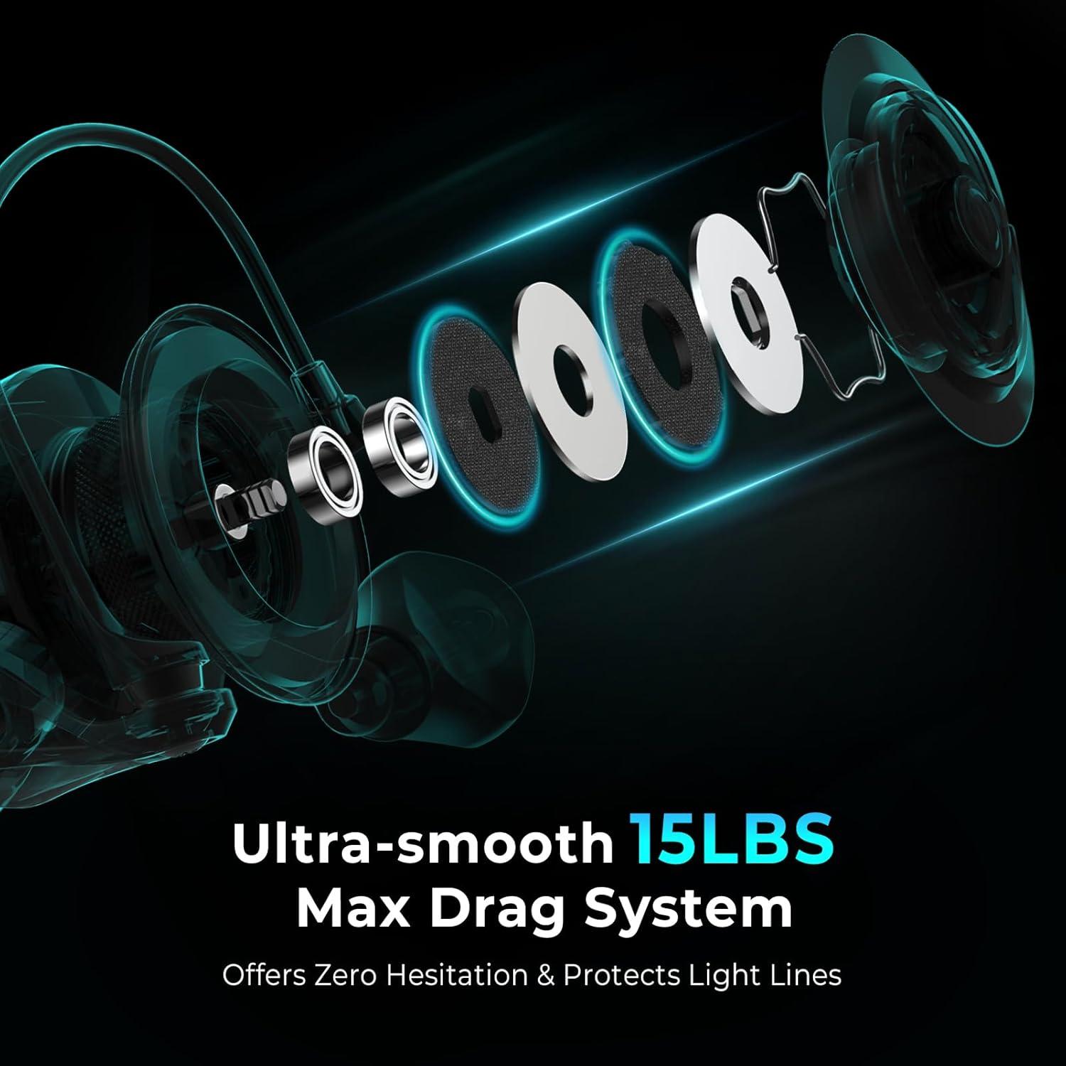 Exceptionally Strong Drag: This reel offers versatile drag capabilities. Sizes 2000/3000 feature an ultra-smooth double-disc carbon fiber drag system, yielding a remarkable 15lbs of max drag. Sizes 4000/5000 incorporate a triple-disc carbon fiber drag system, delivering 22lbs of max drag. This carbon fiber drag offers more than just power; it guarantees zero hesitation, ensuring the protection of your light lines while fishing.