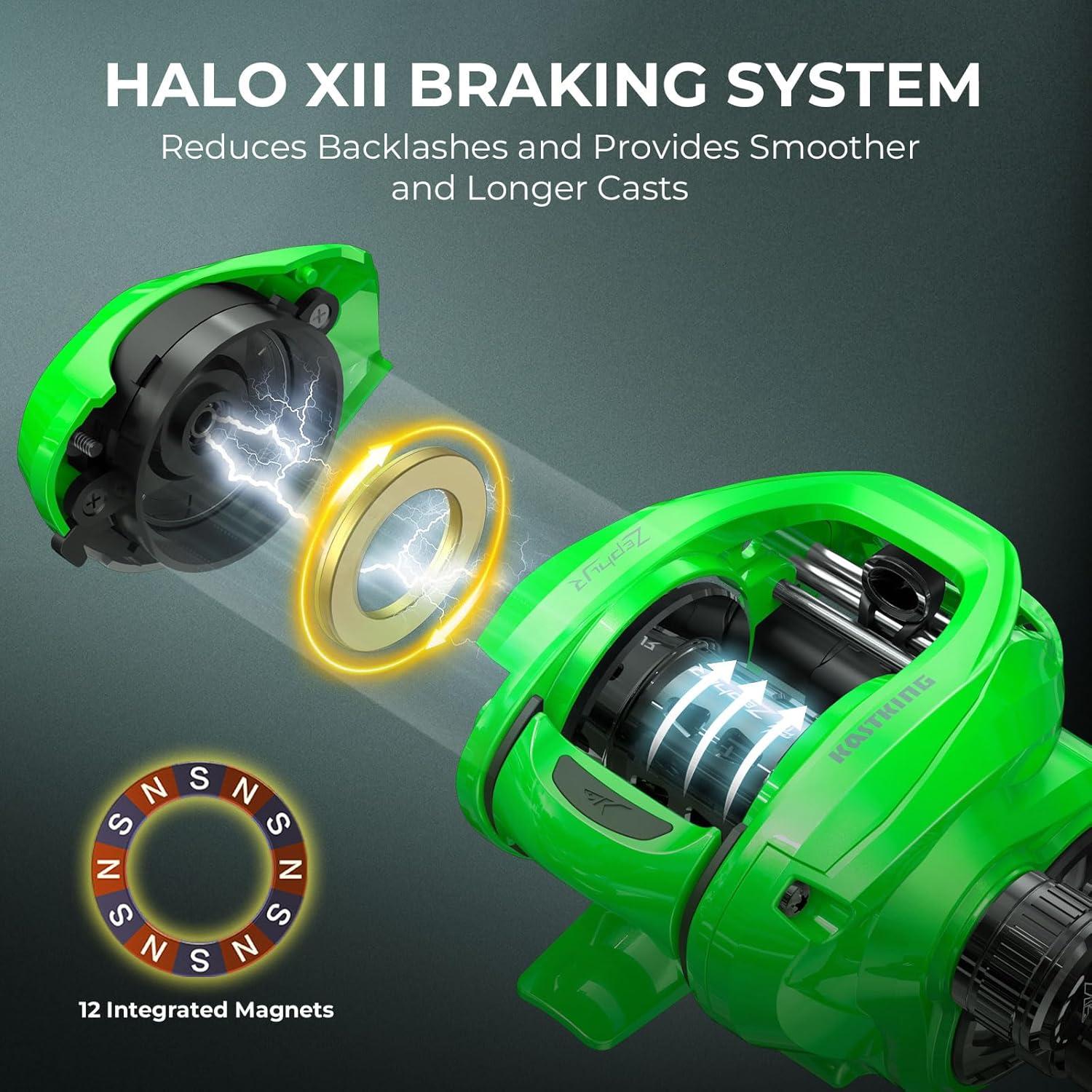 Premium Baitcasting Reel: The KastKing Zephyr Baitcasting Reel boasts a 7.2:1 high-speed gear ratio, 7+1 MaxiDur double-shielded stainless steel ball bearings, precision machined brass gears, and a Halo XII braking system with ten levels of brake adjustment, ensuring effortless performance with minimal effort.